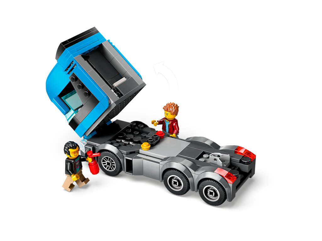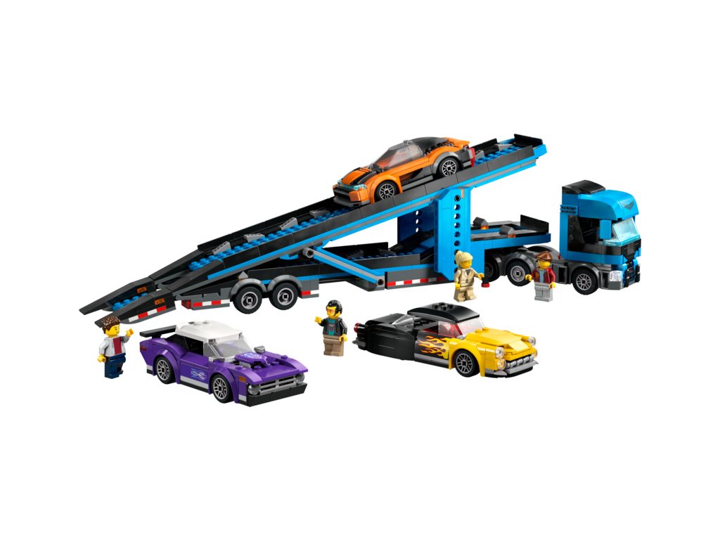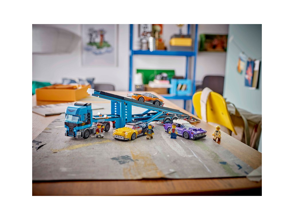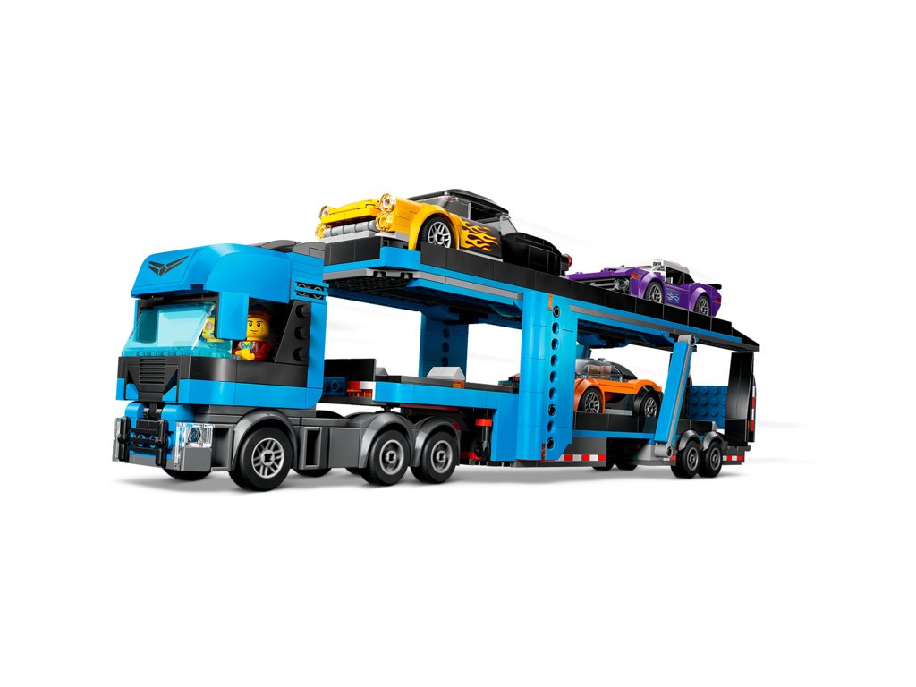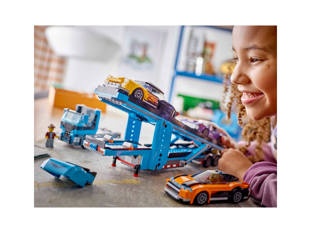 Potěšte milovníky aut od 7 let stavebnicí LEGO® City Kamion pro přepravu aut se sporťáky. Děti mohou naklonit kabinu řidiče, aby se dostaly k motoru, připojit přívěs atd.