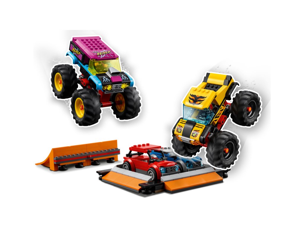 - Co děti najdou v krabici? Všechny dílky potřebné k sestavení 2 monster trucků, 2 aut se skládací střechou, ohnivého kruhu, ramp, motorky se setrvačníkem, stánku s hot dogy a pódia, a navíc 6 minifigurek a spoustu doplňků.