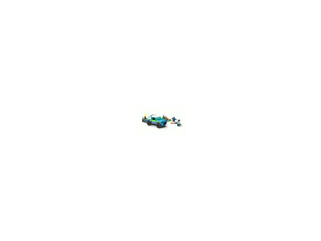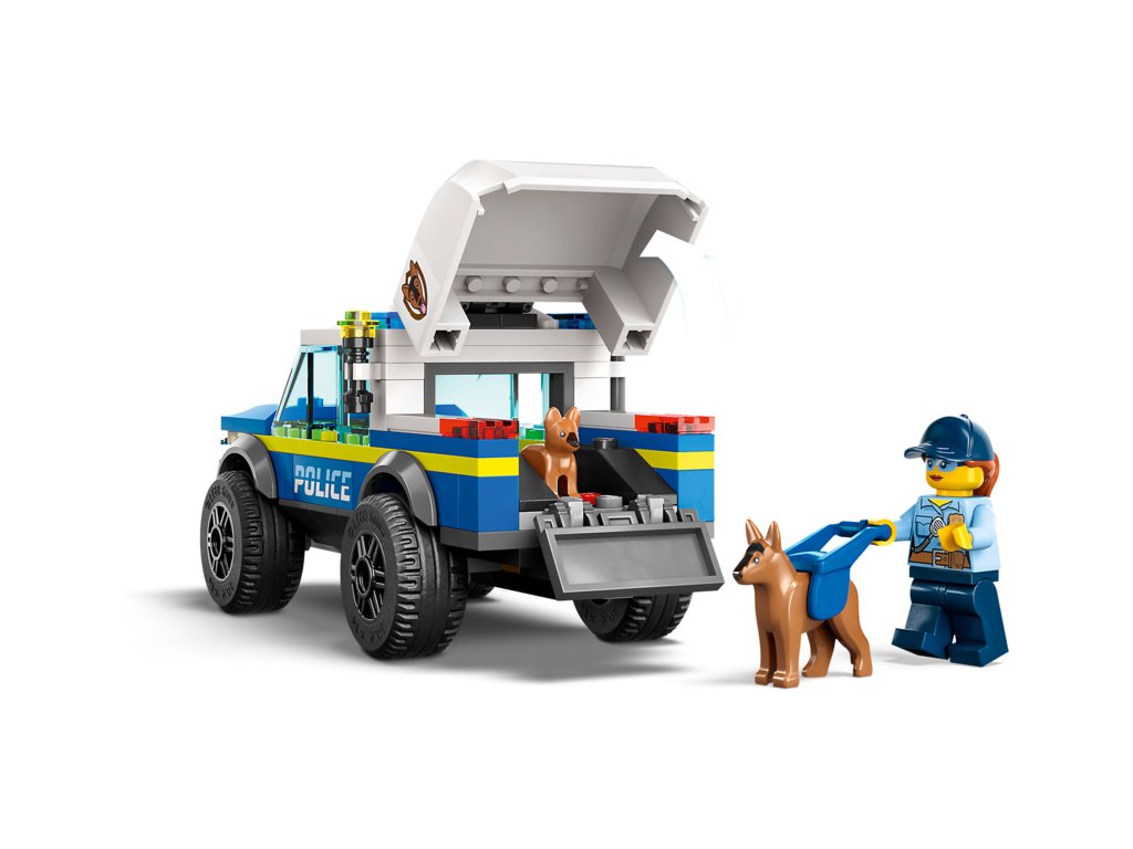 - Co děti najdou v krabici? – Vše, co děti potřebují k sestavení policejního terénního auta, přívěsu a cvičebních překážek, a navíc 2 minifigurky, figurku pejska a figurku štěňátka