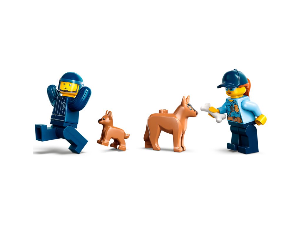 - Doplňky pro minifigurky LEGO® – V této stavebnici na motivy policie najdete kartáč na psy, baterku, lopatu a 2 pamlsky pro psy