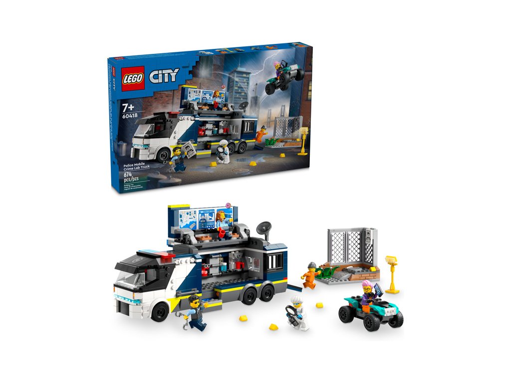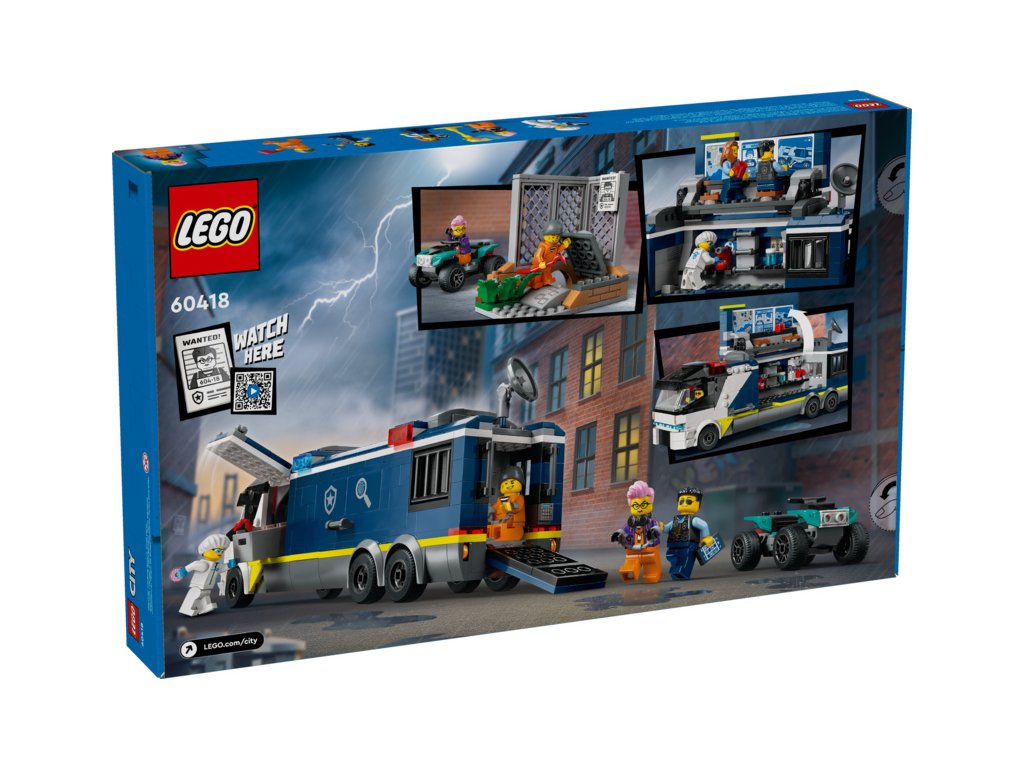 Vyšetřování stop, které za sebou zanechali zločinci na útěku, to je úkol pro policisty ve stavebnici 60418 LEGO® City Mobilní kriminalistická laboratoř policistů. Tato skvělá herní sada pro děti od 7 let obsahuje nákladní auto, které se otevře a odhalí dvouúrovňovou laboratoř pro zkoumání místa činu s pracovišti, mapou, monitory, mikroskopem, kávovarem a vězením. Součástí sady je také forenzní scéna a čtyřkolka zločinců. Pro vskutku epická dobrodružství stačí přidat minifigurky 2 policistů, 1 vědce a 2 zločinců.