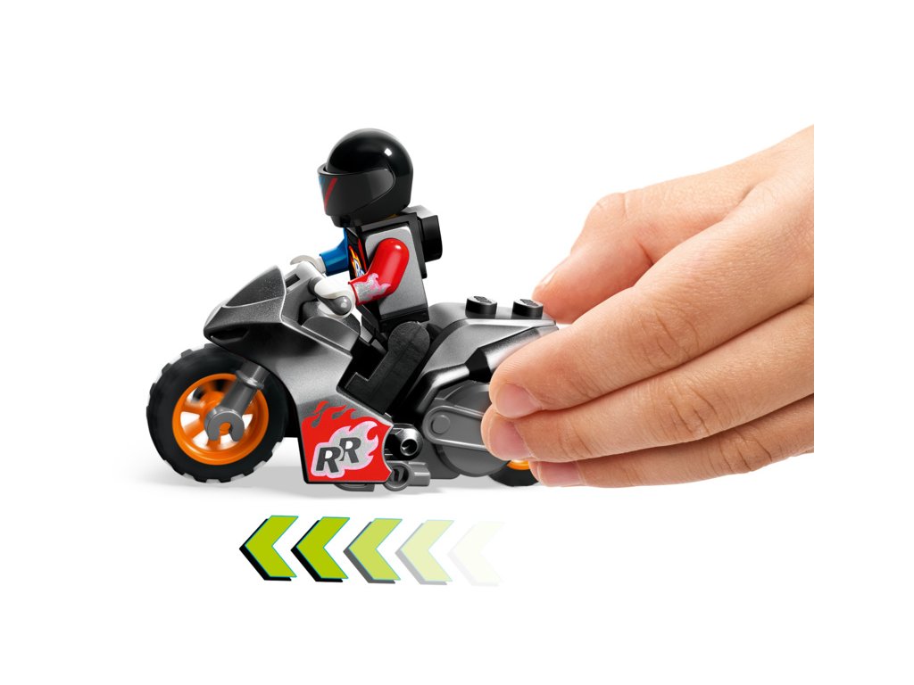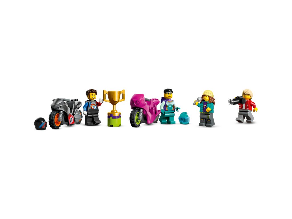 - Co vás čeká v krabici? – V této kaskadérské stavebnici najdete 360° smyčku, ohnivý kruh, „mimozemšťanskou věž“ pro svislé šplhání, rampu, 2 kaskadérské motorky a 2 minifigurky jezdců