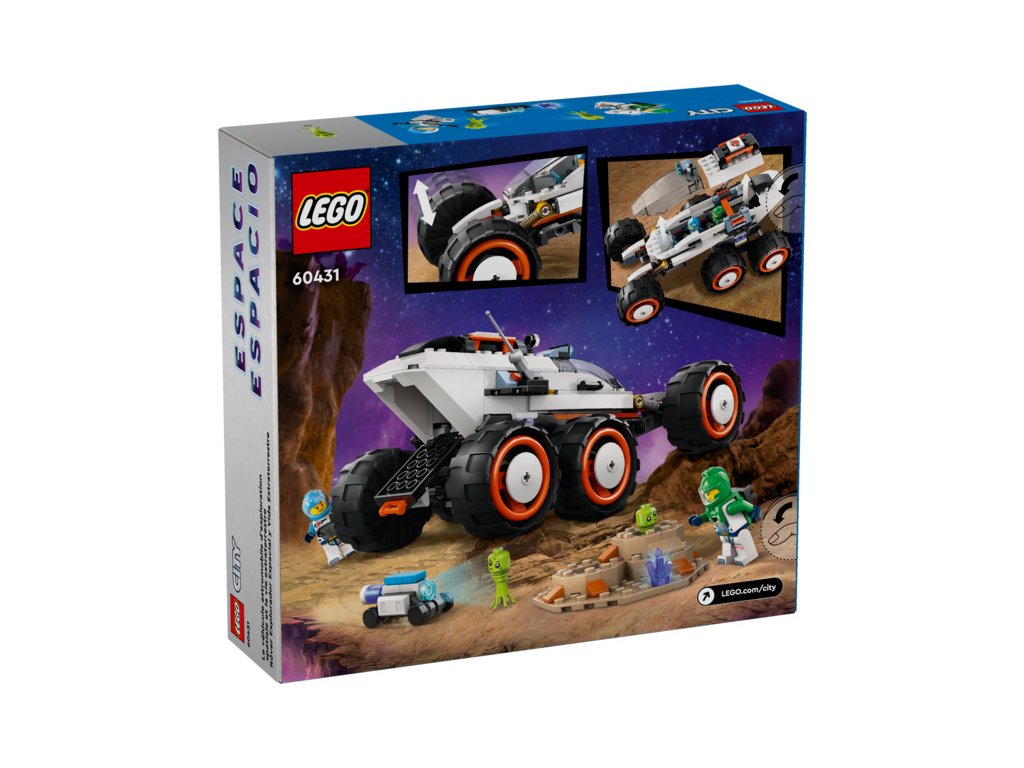 S touto stavebnicí 60431 LEGO® City Průzkumné vesmírné vozidlo a mimozemský život se mohou děti od 6 let pustit do projíždění nových světů. Odolné vozidlo pro průzkum vesmíru je vybaveno 6 velkými pneumatikami a pokročilým odpružením pro jízdu po kamenitém terénu planety. Děti se mohou připojit k posádce, která mapuje povrch planety a objevuje podivné gejzíry tryskající páru a mimozemský život. Součástí této zábavné stavebnice jsou 2 minifigurky vesmírné posádky, robot a figurky mimozemšťanů.