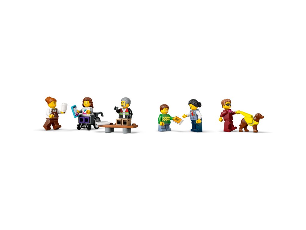 - Co najdete v krabici? – Tato stavebnice od LEGO® City obsahuje vše, co děti potřebují k sestavení tramvaje a zastávky s nástupištěm pro cestující a kavárnou, a navíc 6 minifigurek a figurku vodicího psa
