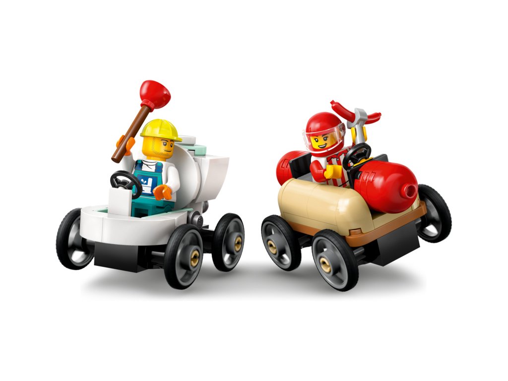 - Co najdete v krabici? – Vše, co děti potřebují k sestavení rampy pro vozidla, minikáry v podobě párku v rohlíku a záchodu a 4 minifigurky včetně řidiče prodavače párků v rohlíku a řidiče instalatéra