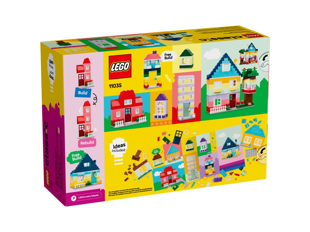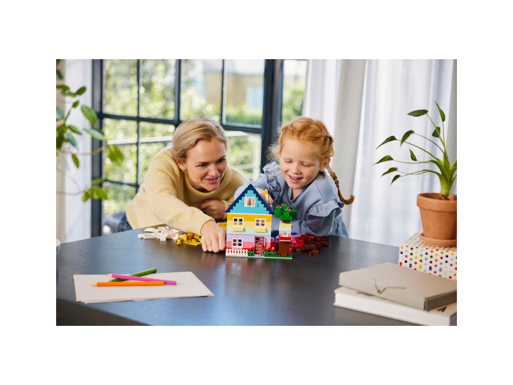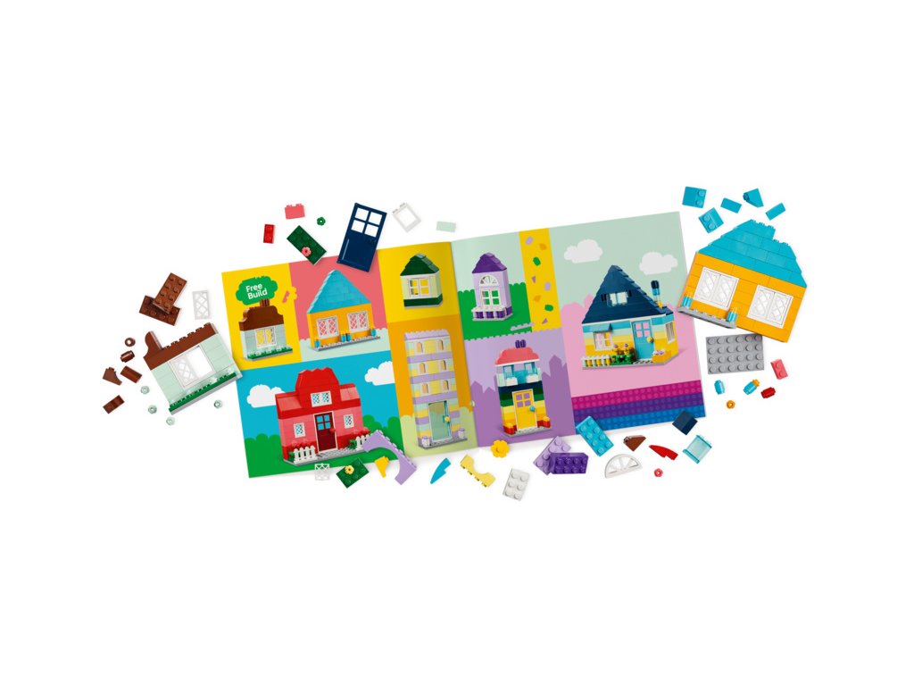 Děti mohou podle jednoduchého návodu postavit 6 modelů domečků rozmanitých velikostí a tvarů. Zábavná kreativní stavebnice dětem umožnuje přidávat kostky a zvětšovat domečky a vyměňovat dveře, okna, střechy, zahrádky a spoustu dalších prvků dle libosti. Sada inspiruje malé stavitele k úpravě stylů jednotlivých modelů. Součástí je 8 tipů na stavění, které podnítí nápadité stavění podle vlastní fantazie. Pro více zábavy mohou děti postavit extra velký domek LEGO ze spousty kostek, které najdou v balení. Malí stavitelé mohou přibližovat, otáčet modely a sledovat pokrok pomocí aplikace LEGO Builder s návodem.
