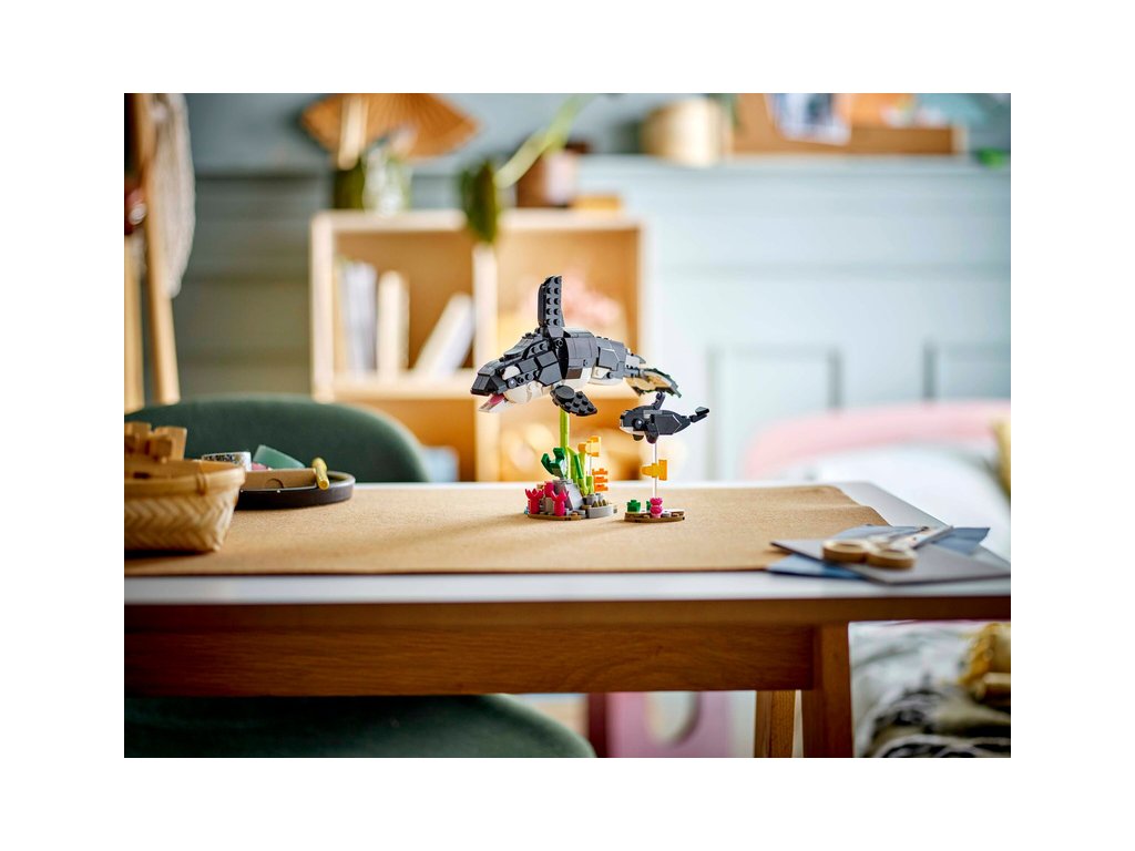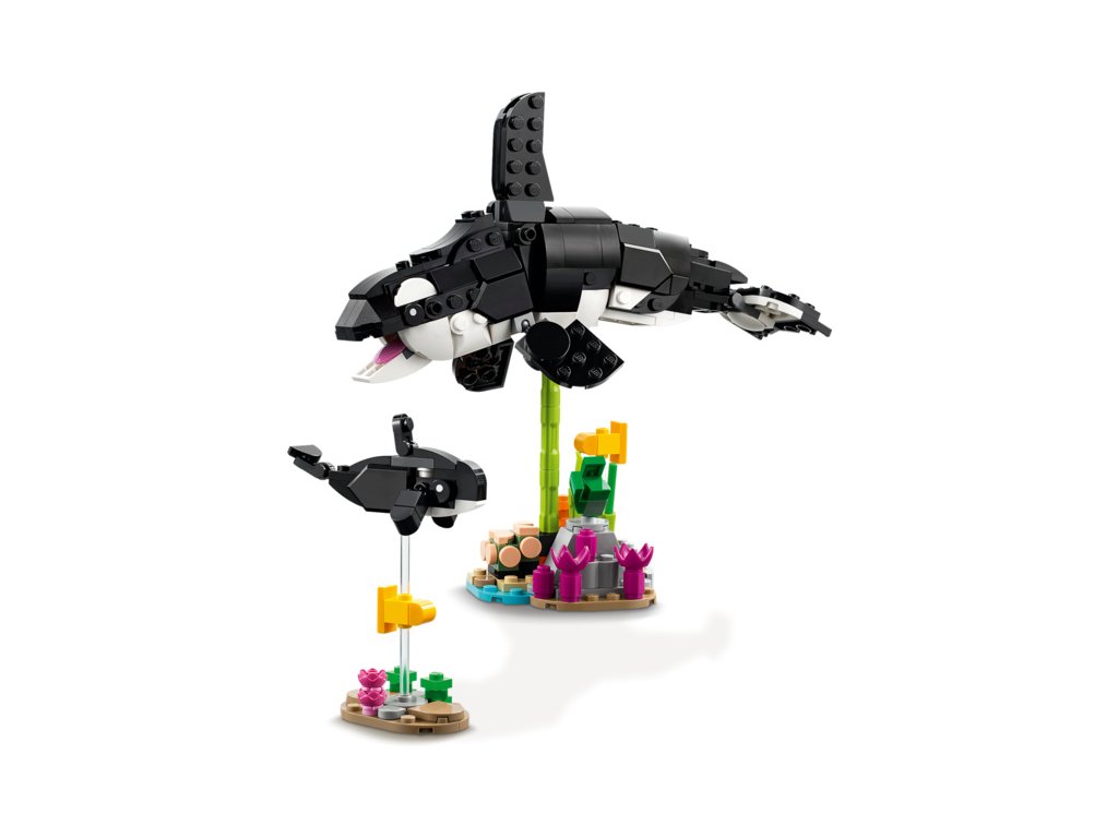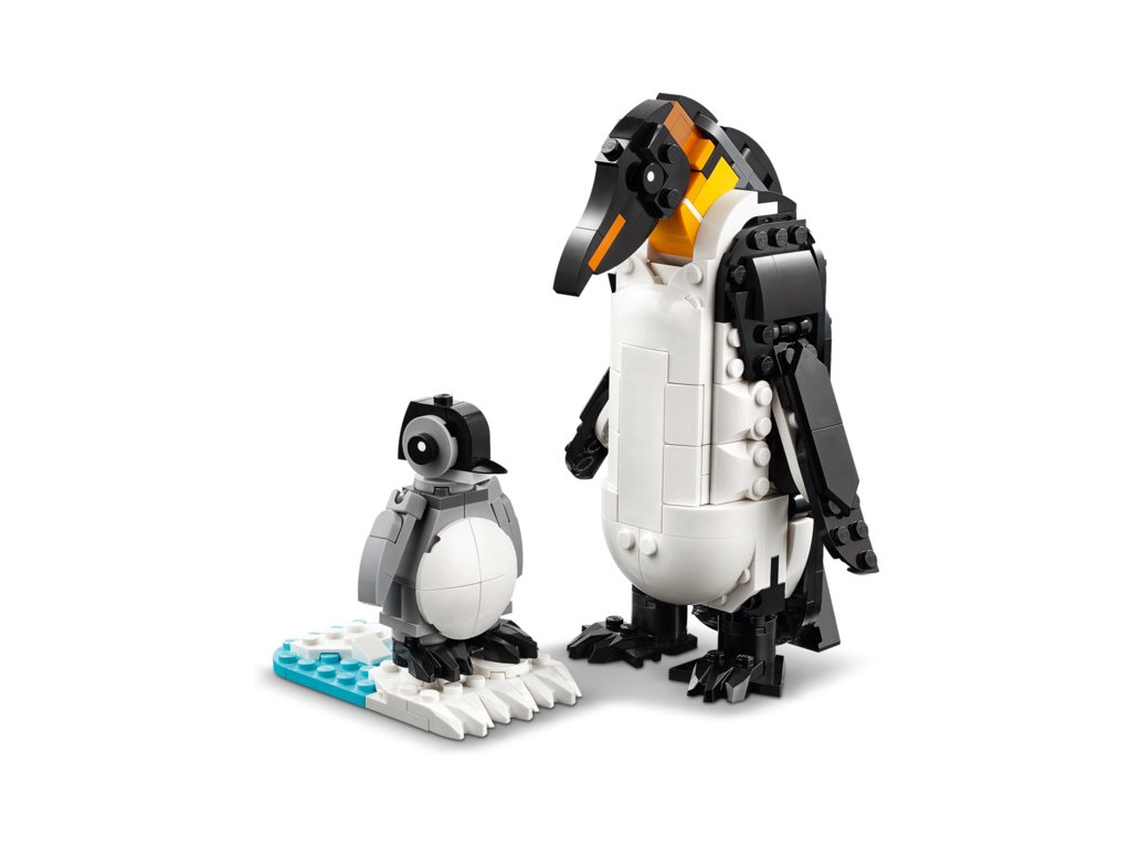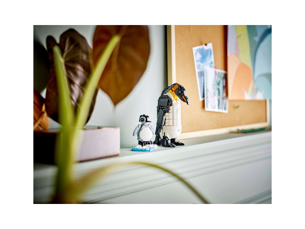 Děti si postaví 3 různé modely zvířátek LEGO® ze stejné sady kostek: pohyblivou figurku pandy s mládětem a bambusovými výhonky, pohyblivou figurku kosatky s mládětem, které můžou vystavit společně na průhledných stojanech nebo pohyblivého tučňáka s mládětem na kousku ledu a vody. Všechny 3 modely představují skvělý dárek LEGO pro děti ke kreativnímu hraní i vystavení.