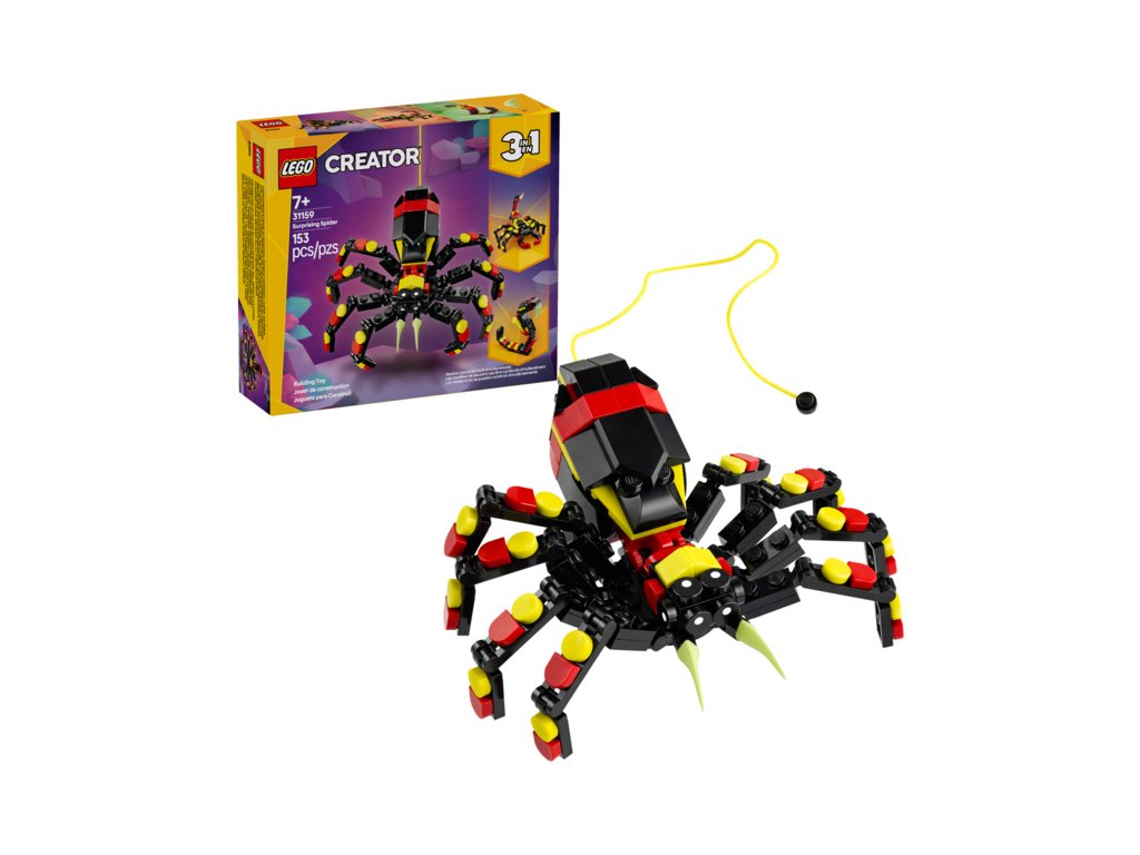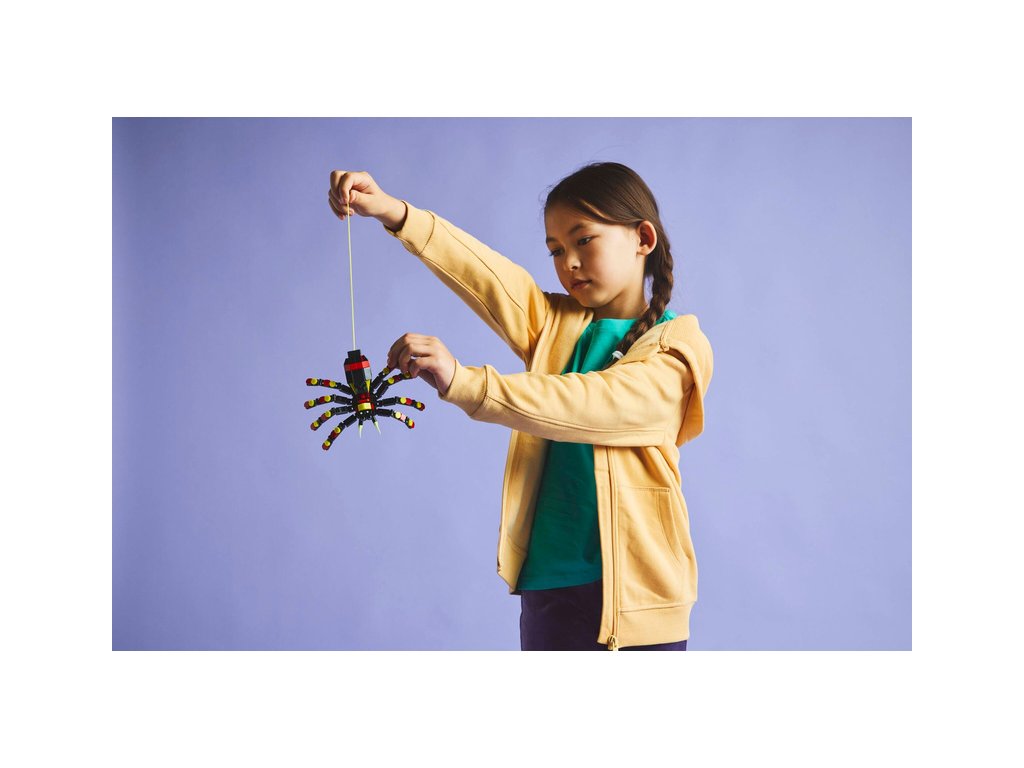 Kluci a holky od 7 let objeví fascinující živočichy se stavebnicí Divoká zvířata: Překvapivý pavouk (31159). Barevný pavouk má 8 pohyblivých nohou a velké zuby a děti z jeho zad můžou vytáhnout neonově žlutou pavučinu, kterou pověsí na kostku LEGO® a užijí si s ní kreativní hraní – nebo si model hrdě vystaví.