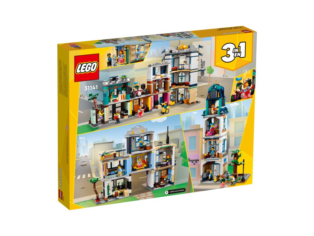 - 3 stavitelské zážitky v 1 sadě – Stavebnice LEGO® Creator 3 v 1 (31141) Hlavní ulice dětem nabízí přehrávání zábavných příběhů ve městě se 3 různými modely: ulicí města, secesním domem a ulicí s trhem