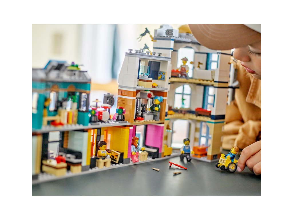 Stavebnice LEGO® Creator 3 v 1 Hlavní ulice dětem nabízí přehrávání zábavných příběhů ve městě se 3 různými modely: ulicí města, secesním domem a ulicí s trhem.