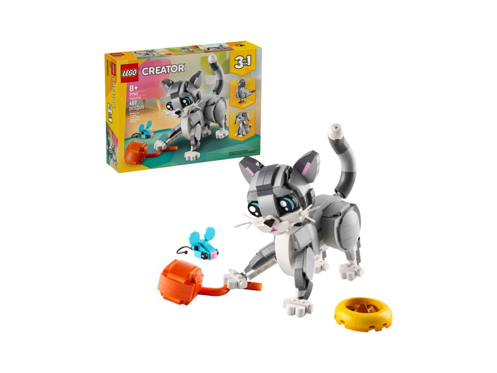 Potěšte milovníky domácích mazlíčků od 8 let rozkošnou stavebnicí LEGO® Creator 3 v 1 (31163) Hravá kočka. S touto stavebnicí domácích mazlíčků si postavíte roztomilou kočku s pohyblivou hlavou, ušima, ocasem a nohama a doplňky, včetně misky na krmení, myši a klubíčka, a děti se s ní můžou hrát na zábavné příběhy.