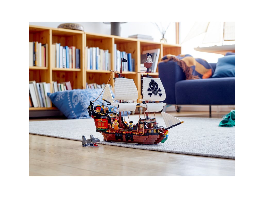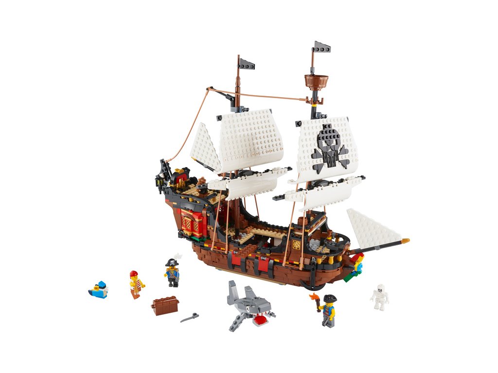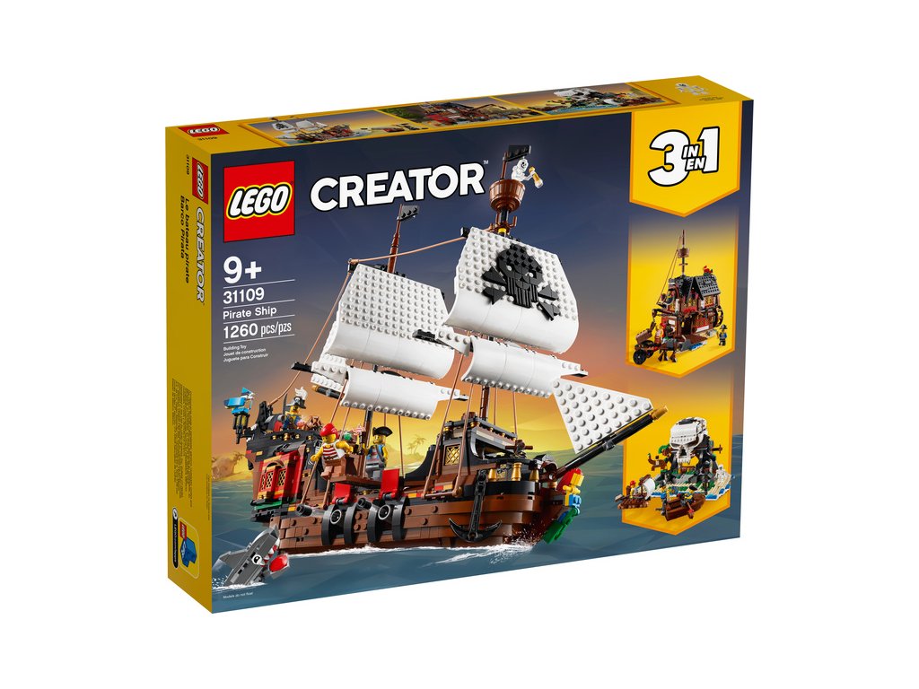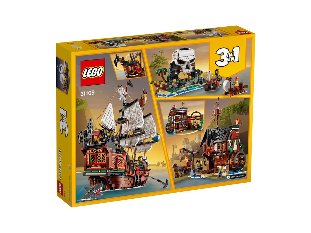 - Stavebnice LEGO Creator 3 v 1 Pirátská loď (31109) děti povzbuzuje ke kreativnímu hraní a nabízí tři modely v jednom: klasickou pirátskou loď, prastarou pirátskou krčmu a záhadný ostrov lebek. Možnost neomezeného přestavování zaručí, že zábava jen tak neskončí.