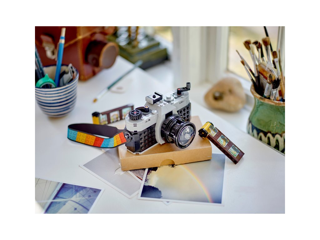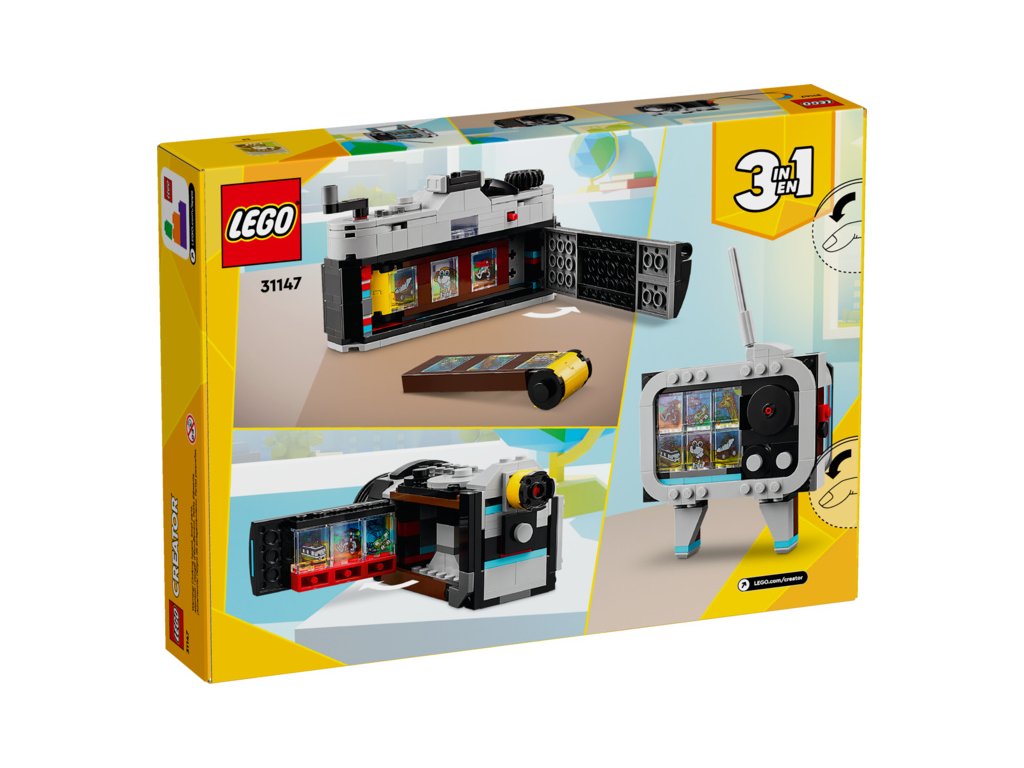 Inspirujte děti od 8 let k nápaditému hraní se stavebnicí LEGO® Creator 3 v 1 (31147) Retro fotoaparát. Model fotoaparátu má pohyblivý objektiv, na horní straně najdete tlačítka k pořízení fotografie a vzadu je otvor, do kterého můžete umístit film z kostek a barevný textilní pásek na nošení. Součástí je také 6 samolepek, které představují fotografie a děti je nalepí na jednotlivá filmová políčka.