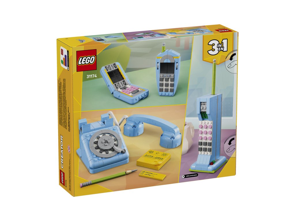 Tato působivá stavebnice LEGO nabízí hned 3 různé možnosti stavění ze stejné sady kostek: retro telefon z 60. let, telefon z 80. let na nabíjecí základně nebo 2 parádní telefony ze začátku tisíciletí. Stavebnice LEGO Creator 3 v 1 představují skvělé dárky pro děti díky 3 různým možnostem sestavení v každé krabici. S přestavitelnými stavebnicemi 3 v 1 si děti užijí hodiny tvořivého hraní a každý stavitel si přijde na své. Všechny modely z této stavebnice nelze sestavit současně. Stavebnice obsahuje 383 dílků.