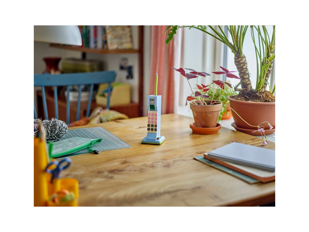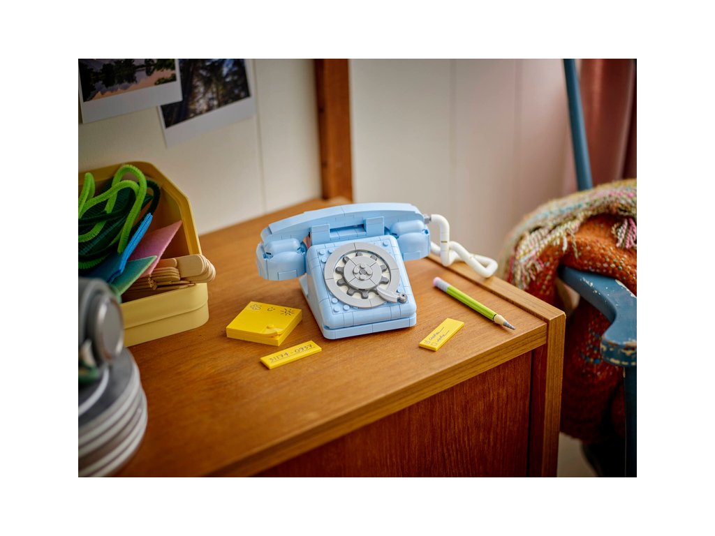 - Spousta zábavných doplňků – Model telefonu z 60. let má zvedací sluchátko, pohyblivou rotační číselnici a pružinovou funkci, kterou aktivujete při zavěšení, tužku z kostek a přizpůsobitelný samolepicí poznámkový blok