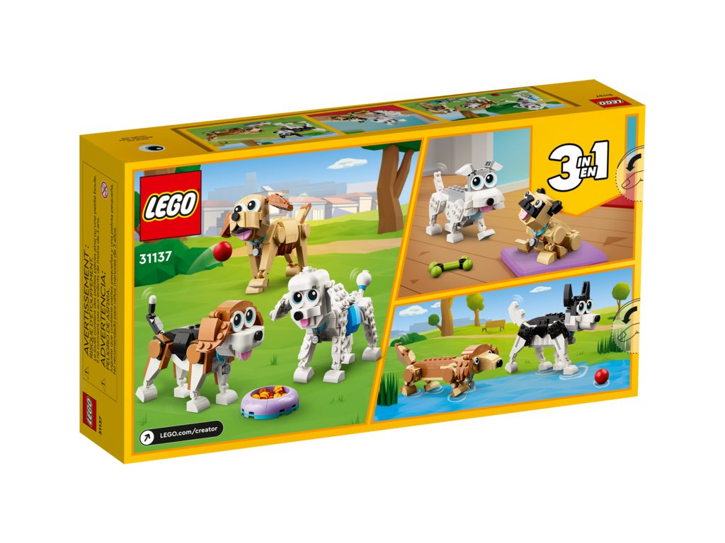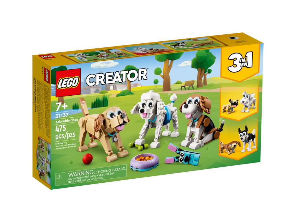 Milovníci psů a děti od 7 let si užijí legraci s rozkošnými chlupáči ze stavebnice LEGO® Creator 3 v 1 Roztomilí pejsci (31137). Mohou se těšit na bígla, pudla a labradora s pohyblivými hlavami, ocasy a ušima, a navíc také na nápadité doplňky, včetně misky, hřebenu, hračky v podobě králíka, balónku a vodítka, které dodají ještě více herních možností.