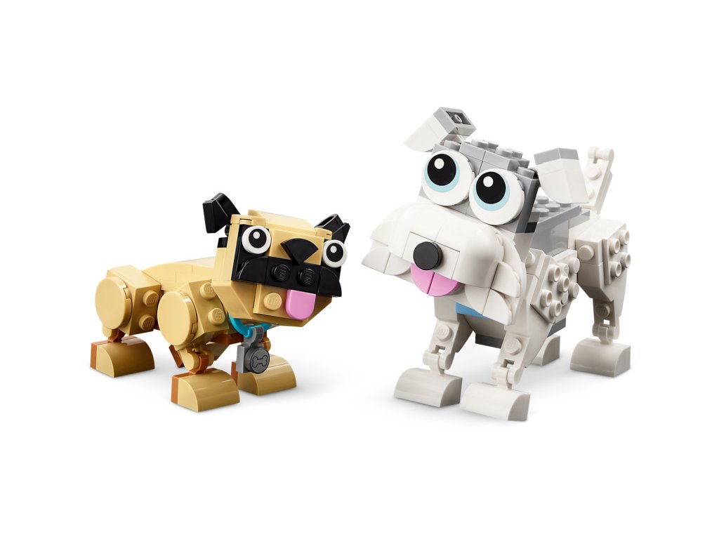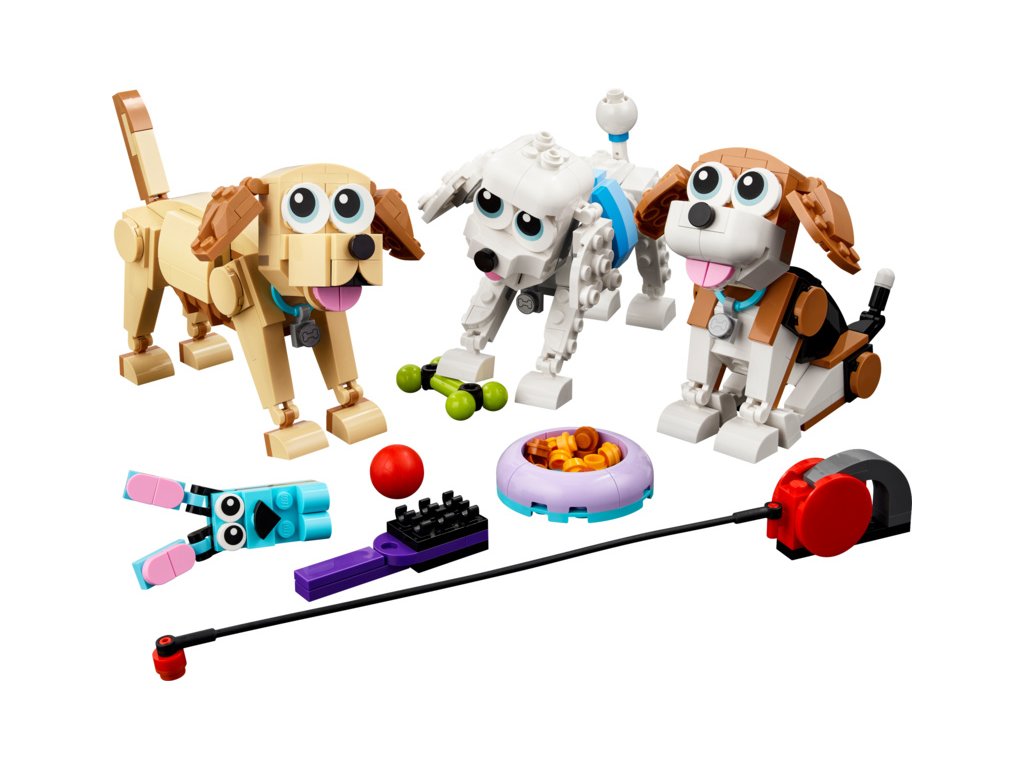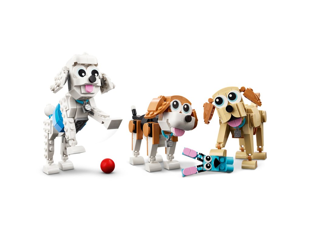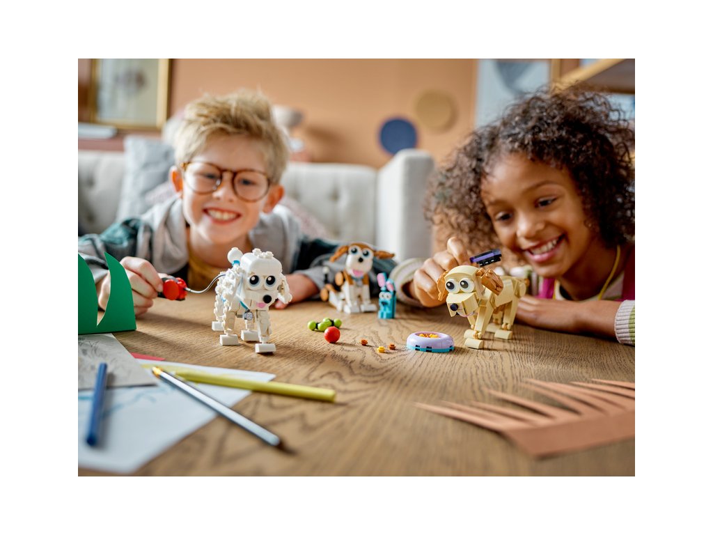 Milovníci psů si užijí legraci s rozkošnými chlupáči ze stavebnice LEGO® Creator 3 v 1 Roztomilí pejsci. Mohou se těšit na bígla, pudla a labradora s pohyblivými hlavami, ocasy a ušima, a navíc také na nápadité doplňky.