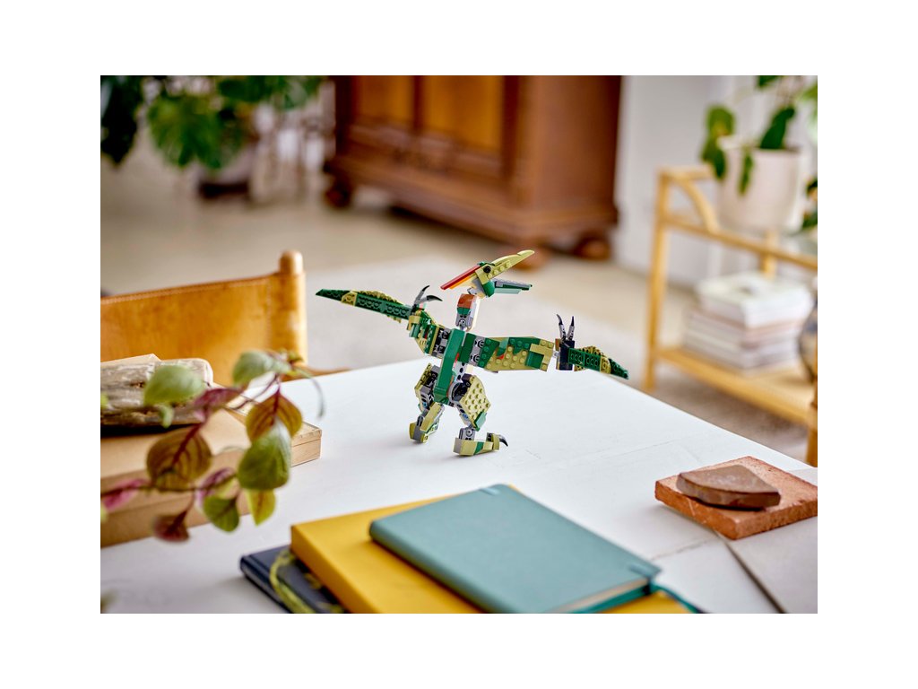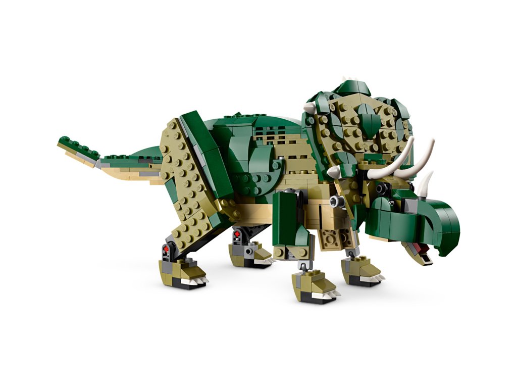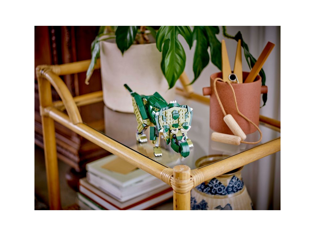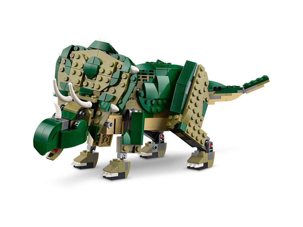 Tato dinosauří stavebnice LEGO® dětem přináší svět plný strhujících herních možností se 3 různými dinosauřími hračkami, které si postaví ze stejné sady kostek. Mohou vytvořit pohyblivého T-rexe, přestavět ho na obávaného triceratopse se 3 rohy nebo ho proměnit v pterodaktyla s velkými pohyblivými křídly.