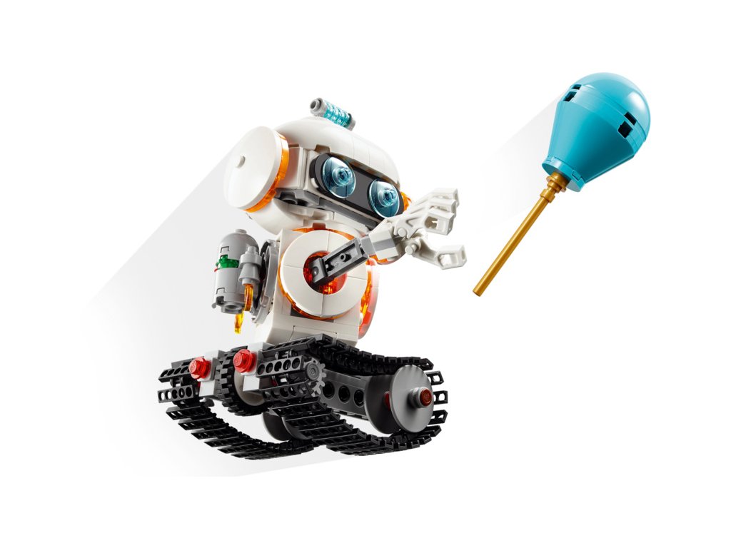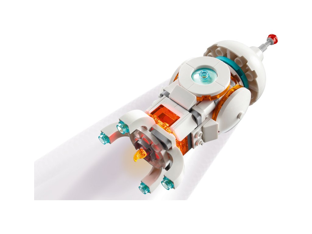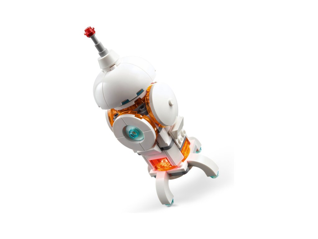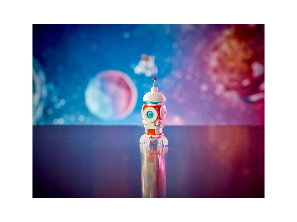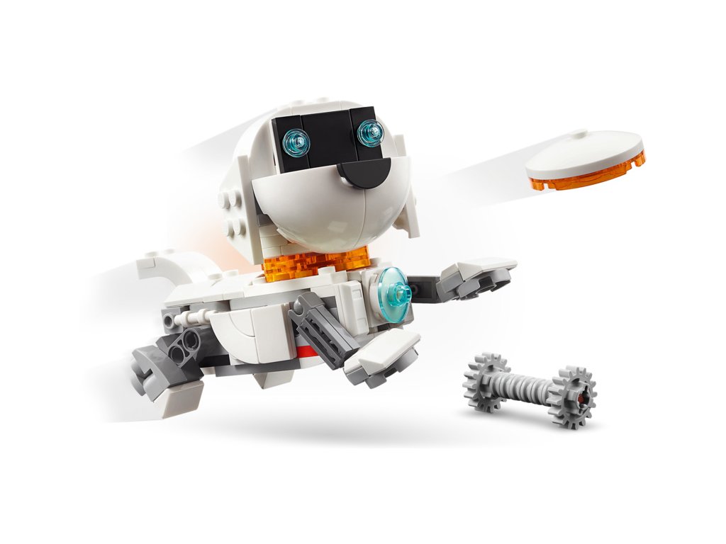 Fanoušci LEGO můžou stavět a přestavovat 3 různé akční vesmírné modely ze stejných kostek: robota na pohyblivých pásech, pohyblivou figurku vesmírného psa s kostí a létajícím diskem nebo vesmírnou raketu. Všechny 3 modely představují parádní dárky s vesmírnou tematikou, se kterými si děti užijí spoustu zábavy. Stisknutím světelné kostky (baterie jsou součástí balení) děti model rozsvítí.