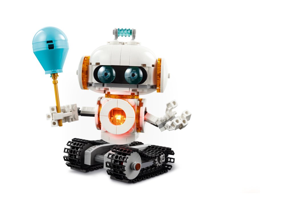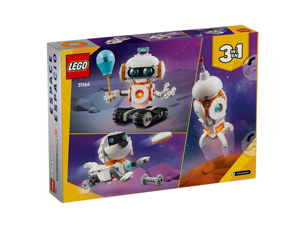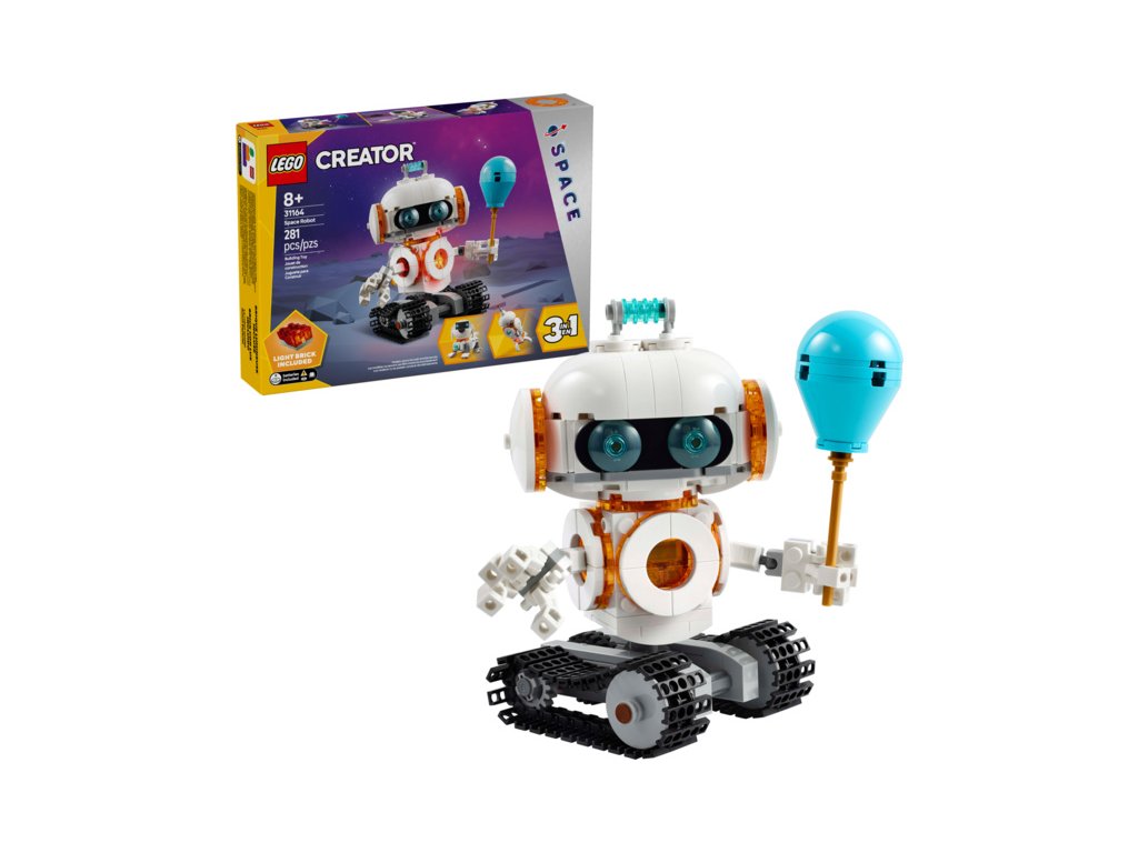 Kluci a holky od 8 let si přehrají příběhy z hvězd s vědeckou stavebnicí LEGO® Creator 3 v 1 (31164) Vesmírný robot. Tento model robota pro děti má pohyblivé pásy a jetpack, otáčecí tělo a hlavu, pohyblivé paže a prsty, balón a světelnou kostku, která osvětluje jeho trup.