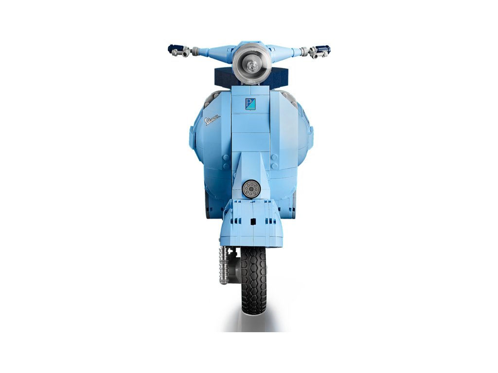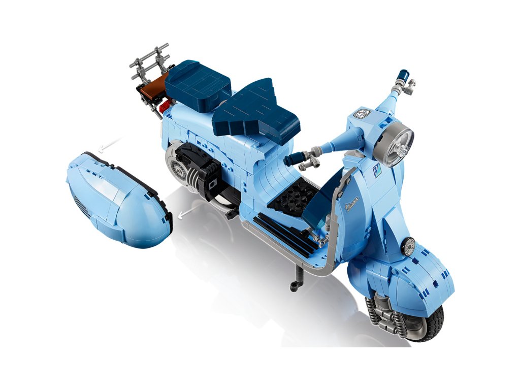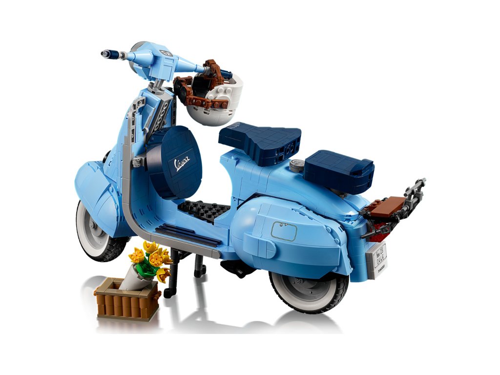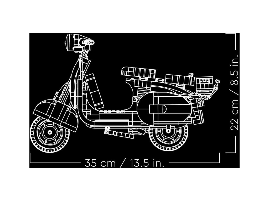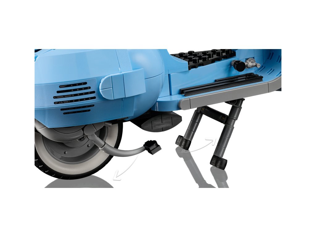Stejně jako u původní předlohy je i u sestavitelného modelu skútru Vespa přední kolo uchyceno pouze z jedné strany. Dále má model sedačku pro 2 pasažéry, odnímatelnou kapotu, pod kterou se ukrývá motor sestavený z kostek, i funkční stojan a řízení. Nesmí chybět logo Vespa, klasická italská poznávací značka ve stylu 60. let, náhradní pneumatika, helma ani košík v zádní části s kyticí květin.