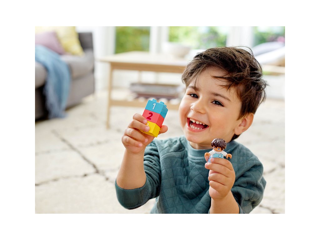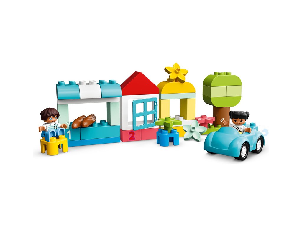 - Součástí je 65 barevných kostek a dílků známých věcí, které budou stimulovat mysl batolete, včetně auta s pohyblivými koly, střechy, okna, květin, chleba, DUPLO® figurek a kostek s čísly 1, 2 a 3.