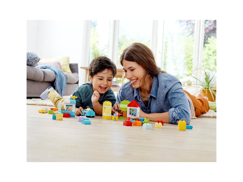 Vzdělávací hračka pro batolata! Pevný úložný box ukrývá auto s pohyblivými koly, střechu, okno, květinu, chleba, DUPLO figurky, kostky s čísly 1, 2 a 3, a k tomu navíc spoustu originálních kostek v zajímavých barvách. Zatímco děti budou spojovat kostky a dílky do nespočtu nápaditých her a modelů, rodiče s nimi mohou sdílet radost a jejich důležité vývojové milníky.