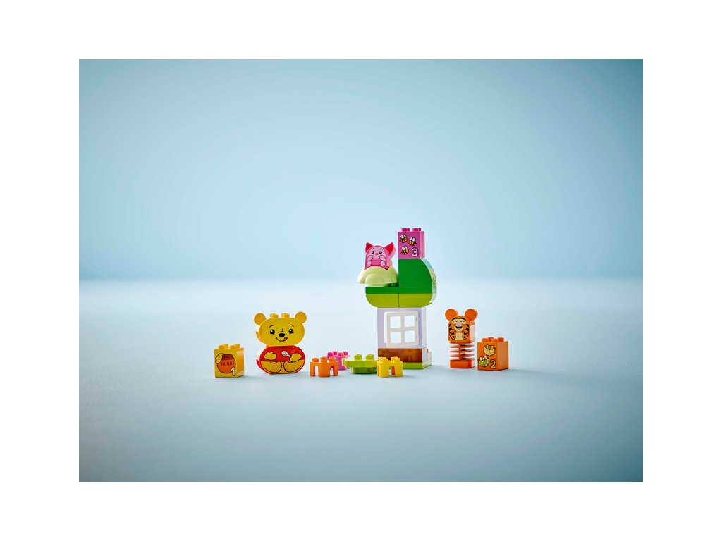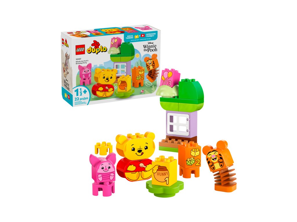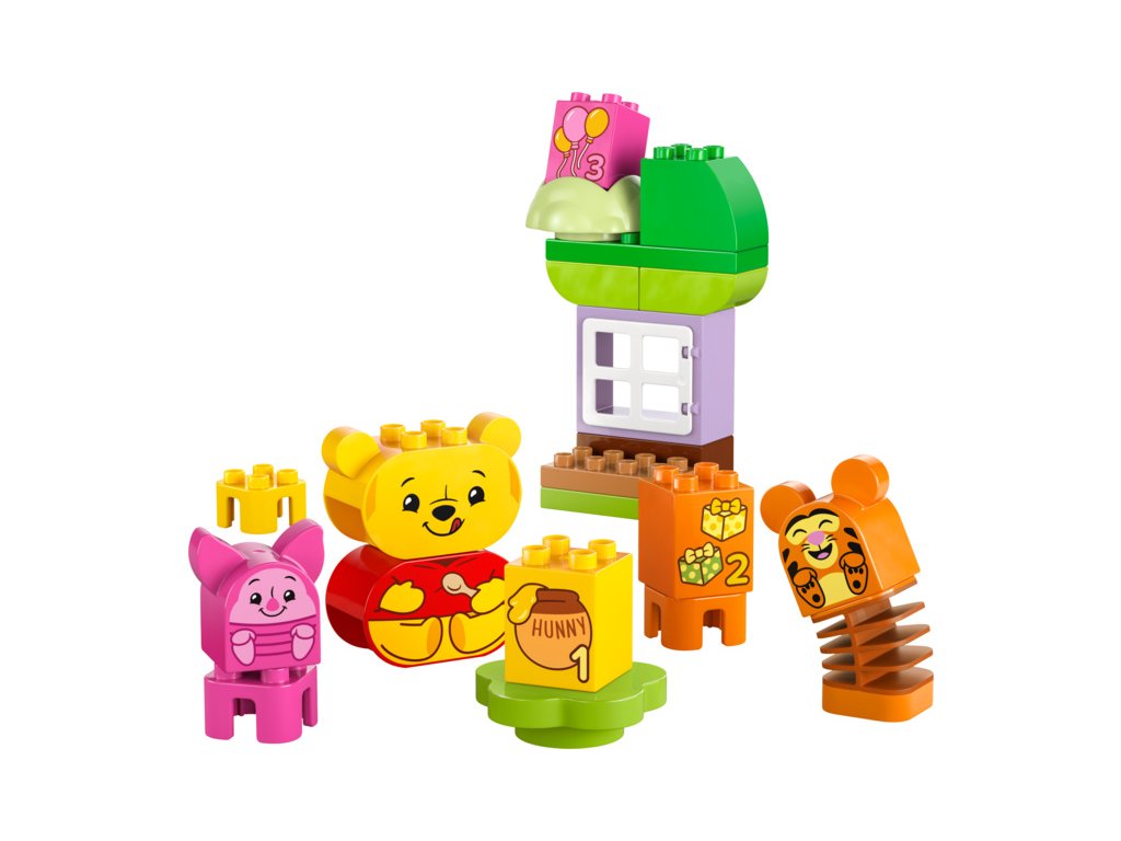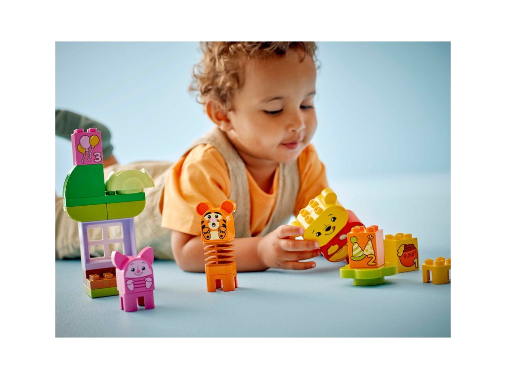 Malé děti si zahrají na oslavu se 3 figurkami LEGO DUPLO: Medvídkem Pú, Tygrem a Prasátkem. Každá postava má oboustranný obličej s různými výrazy, takže děti si můžou vymýšlet nekonečné kreativní hry a nové příběhy. Tato zábavná také pomáhá rozvíjet sociální a dovednosti a empatii nejmenších dětí, které prozkoumají různé emoce během oslavy, od radosti z rozbalování dárků až po nepříjemný pocit po snědení spousty sladkostí!