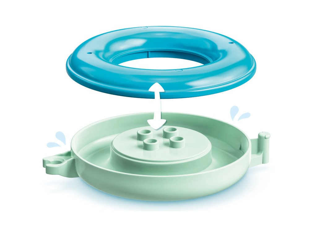 - Zábava a rozvoj dovedností – Malé děti si postaví každé zvířátko ze dvou kostek a pak je umístí do plovoucích kruhů. Kruhy lze spojit a dělají bublinky, když projíždějí vodou
