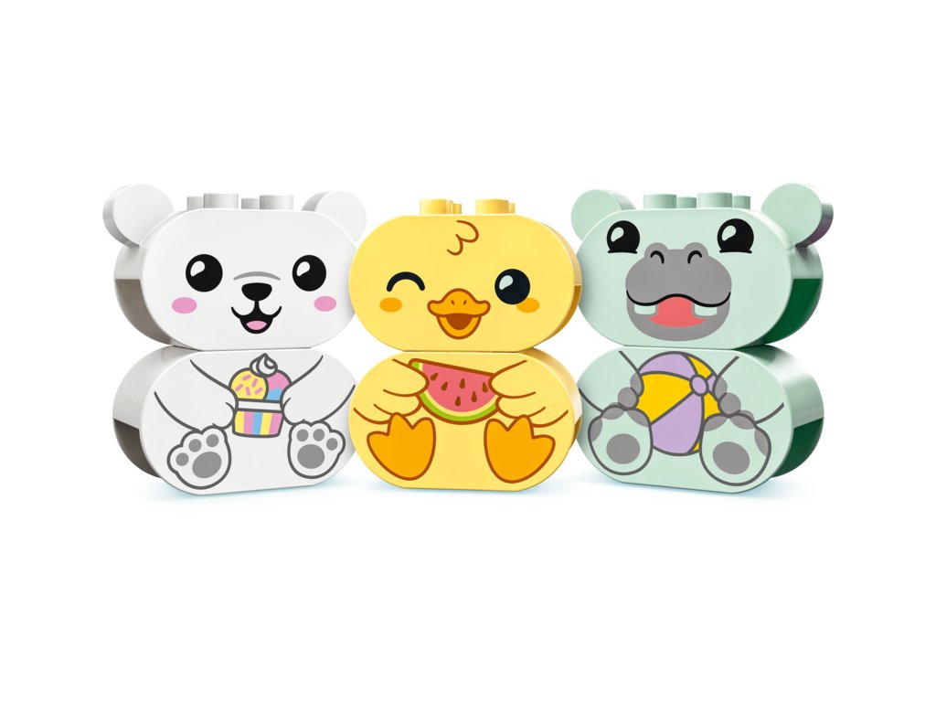 - Sestavitelná zvířátka – Ve stavebnici na vás čeká hroch, kachna a lední medvěd, a navíc také kyblík, mráček a 3 plovoucí kruhy, které lze otevřít pro snadné mytí