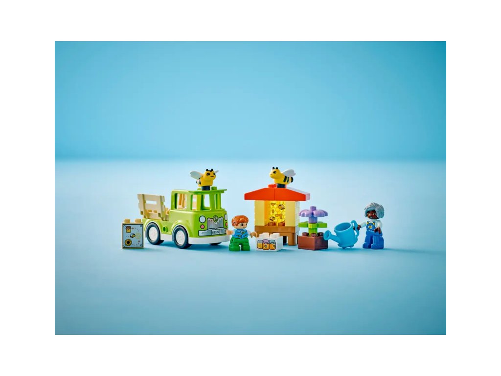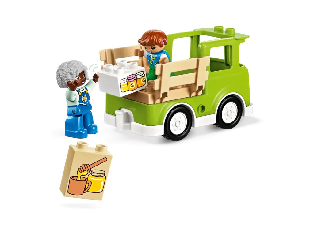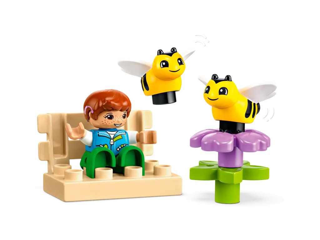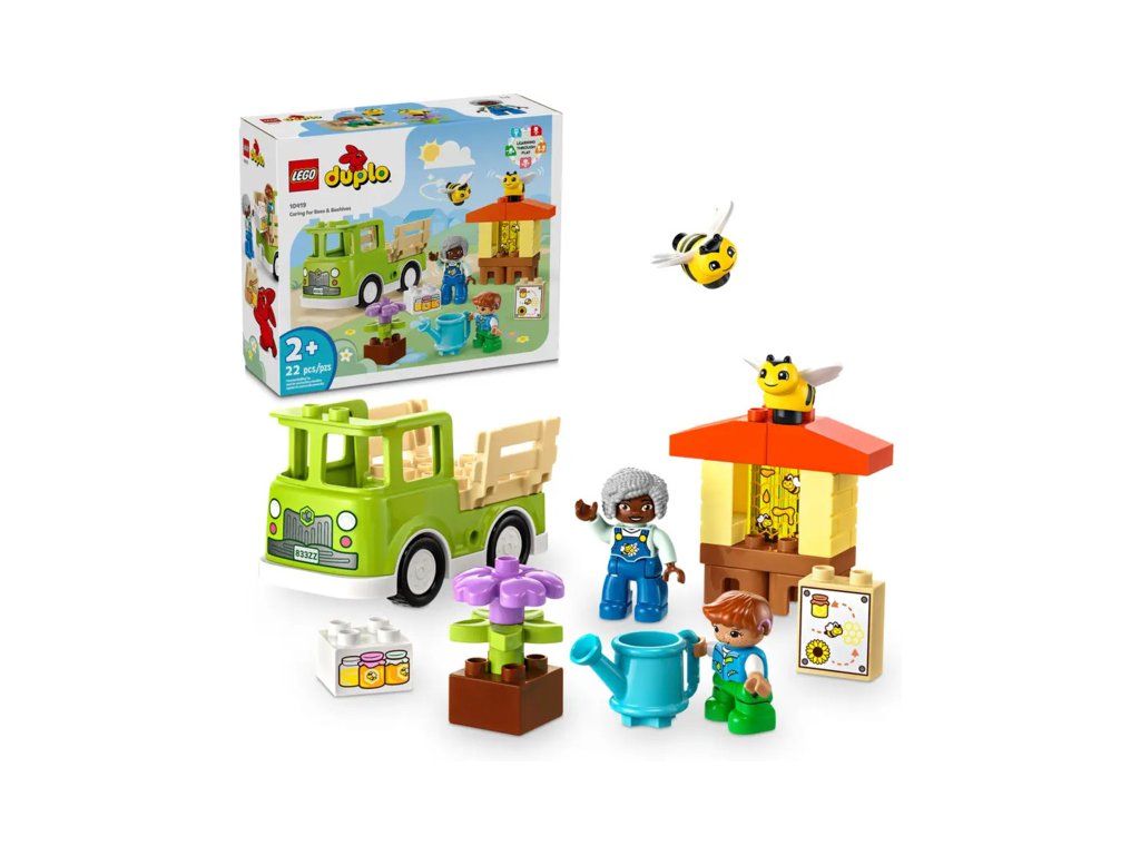 Děti poskládají stonky květin, které „rostou“, a procvičí své jemné motorické schopnosti. Užijí si hodiny zábavy při hře s včelkami, které sbírají nektar a v úlu z něj tvoří med. Nechybí ani 2 figurky LEGO DUPLO, kterým malí stavitelé pomohou sbírat med, naložit jej na model náklaďáku a odvézt ho na tržiště.