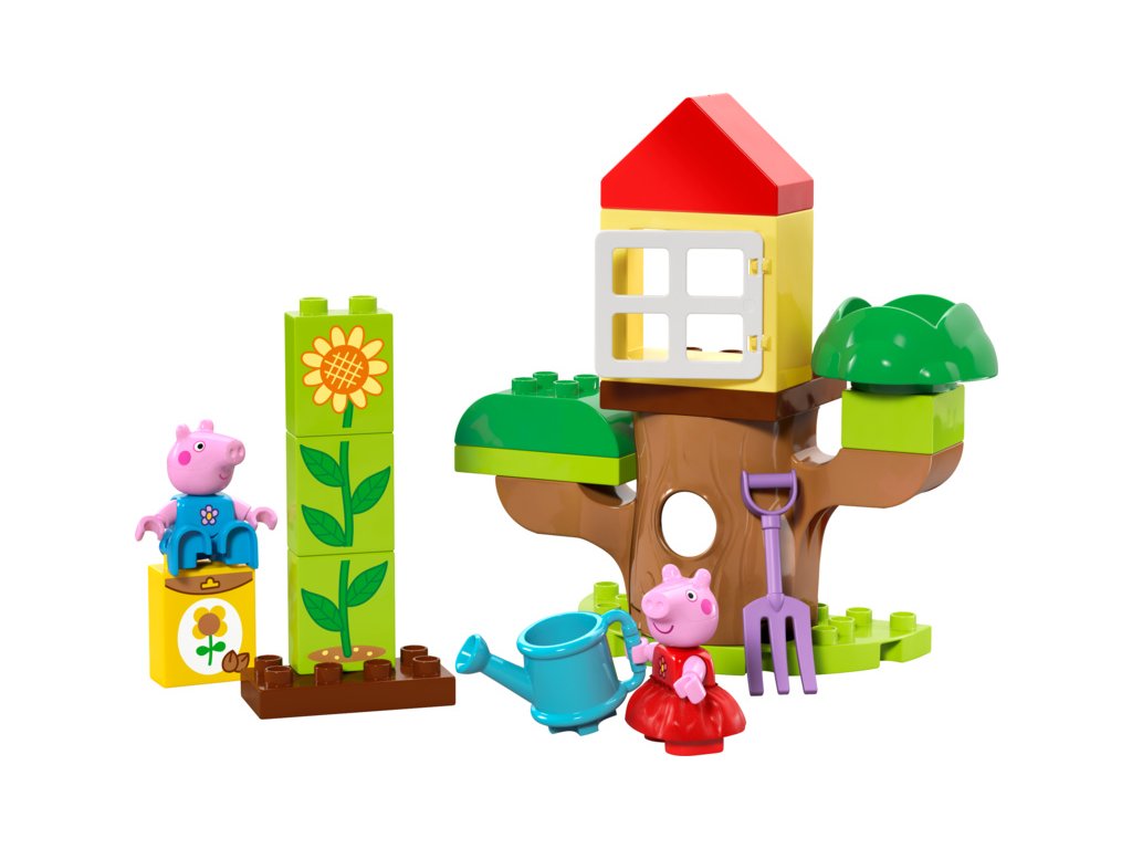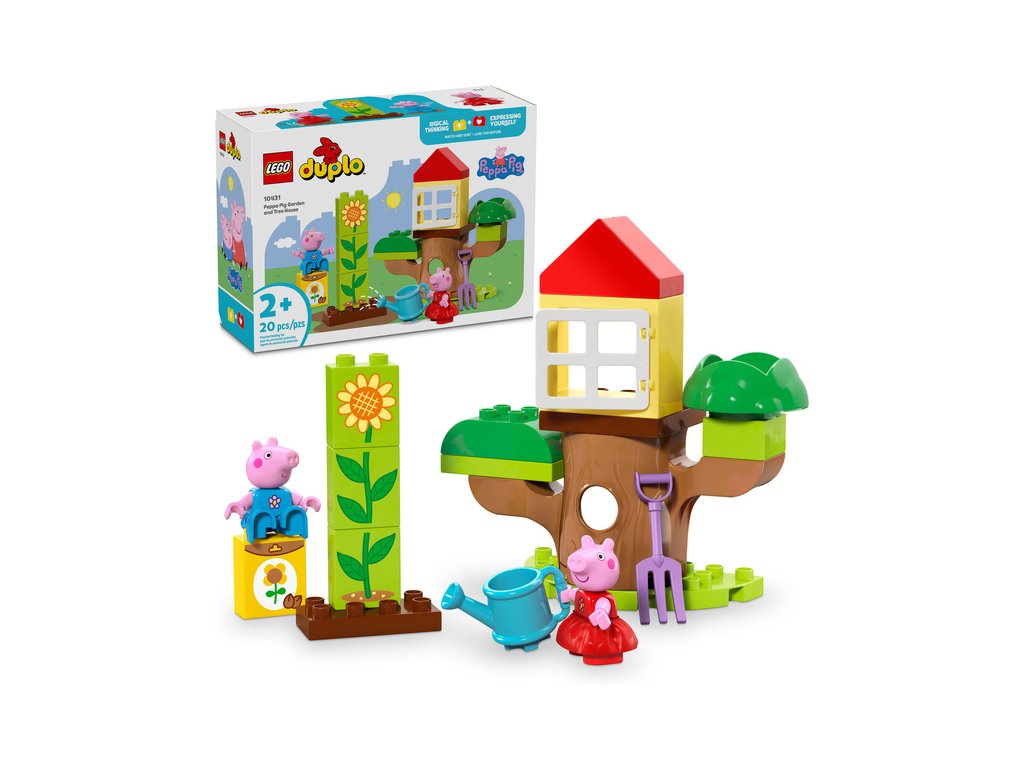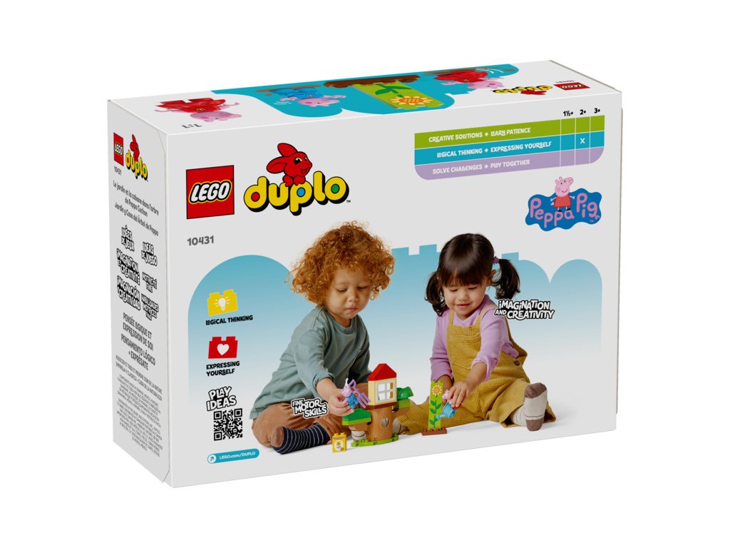 Děti od 2 let se se stavebnicí LEGO® DUPLO® (10431) Prasátko Peppa – zahrada a dům na stromě vydají na dobrodružství venku. Tato stavebnice prohloubí lásku nejmenších dětí k přírodě. Začínající stavitelé si zahrají na den strávený na zahradě a pomůžou Peppě a Tomovi vypěstovat slunečnici.