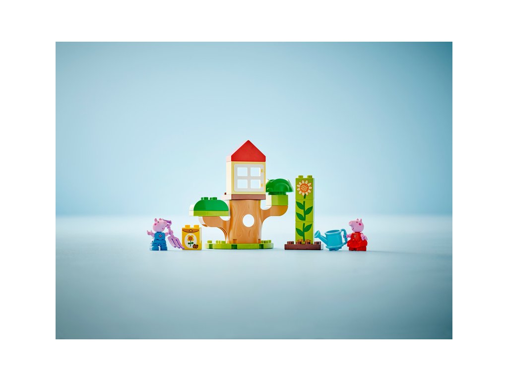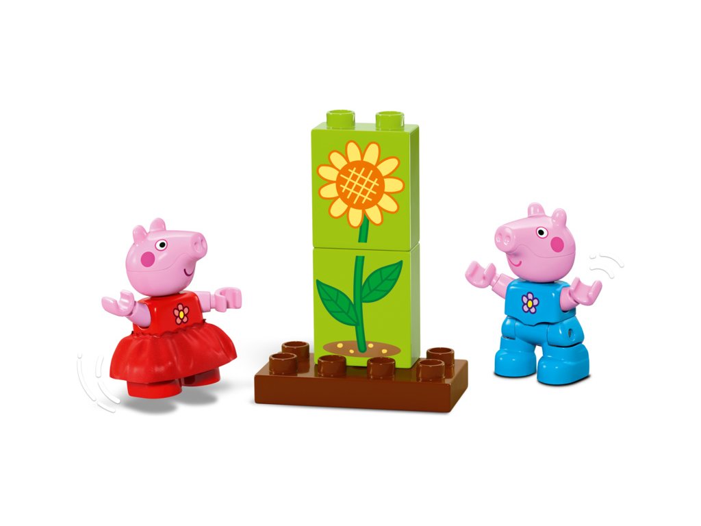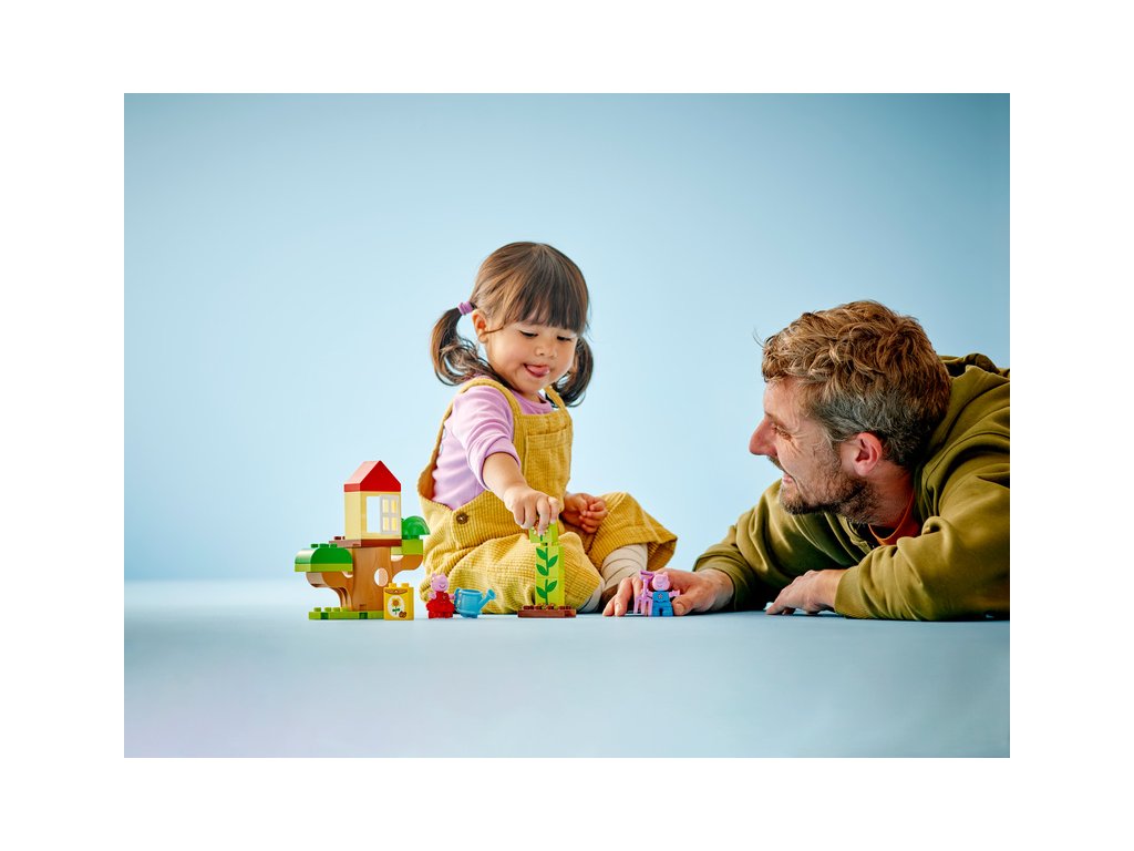 Tato vzdělávací hračka LEGO DUPLO Prasátko Peppa pomáhá malým dětem prohloubit celou řadu dovedností – od řešení problémů a vytrvalosti při pěstování rostlinky až po péči o přírodu a sebevyjádření, když si hrají na Peppu a Toma, kteří spolu pracují a hrají si na zahradě.