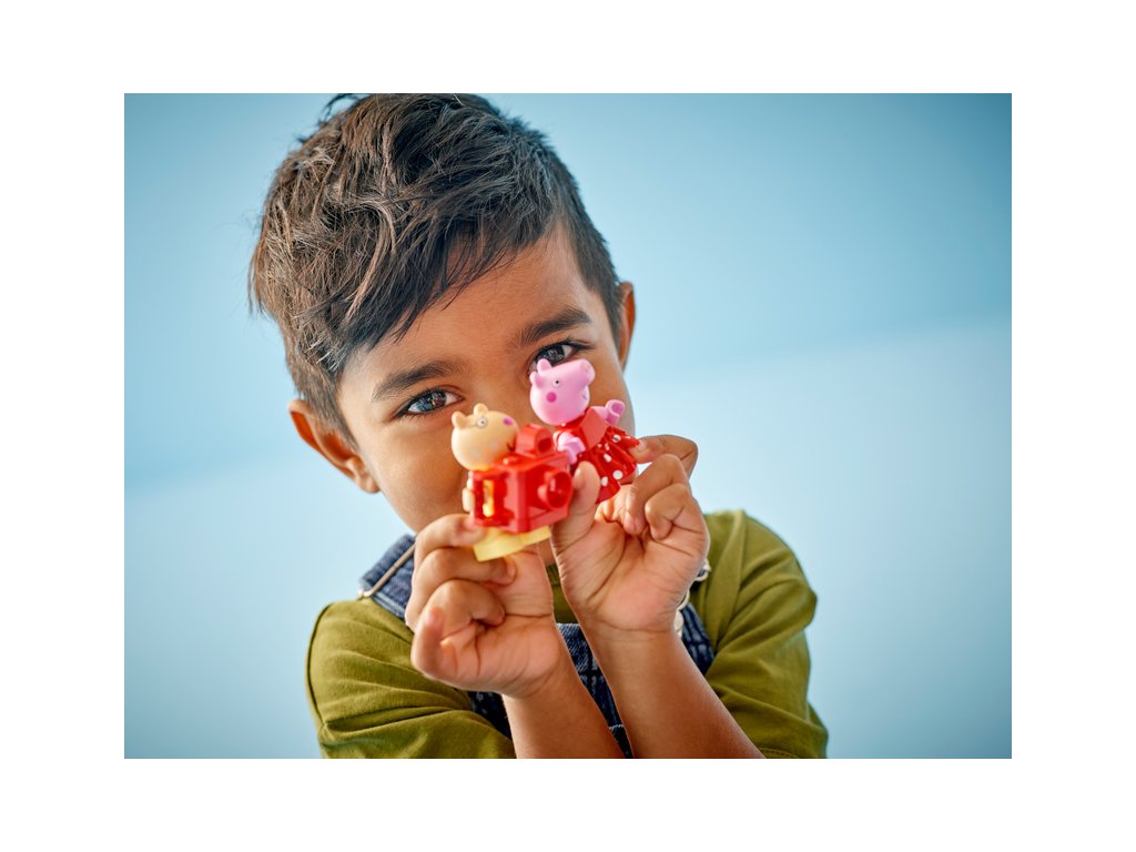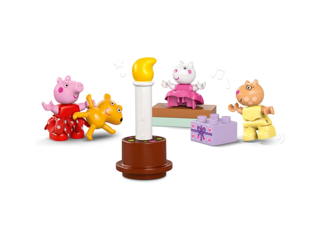 Stavebnice LEGO® DUPLO® Prasátko Peppa jsou navržené tak, aby podporovaly rozvoj celé řady dovedností malých dětí. Malí stavitelé prohlubují své logické myšlení při napodobování skutečného života a inscenování různých aktivit na oslavě, jako je vítání kamarádů, předávání dárečků a krájení dortu. Rozvíjejí také schopnost sebevyjádření, když si představují, že jsou součástí takové radostné oslavy.