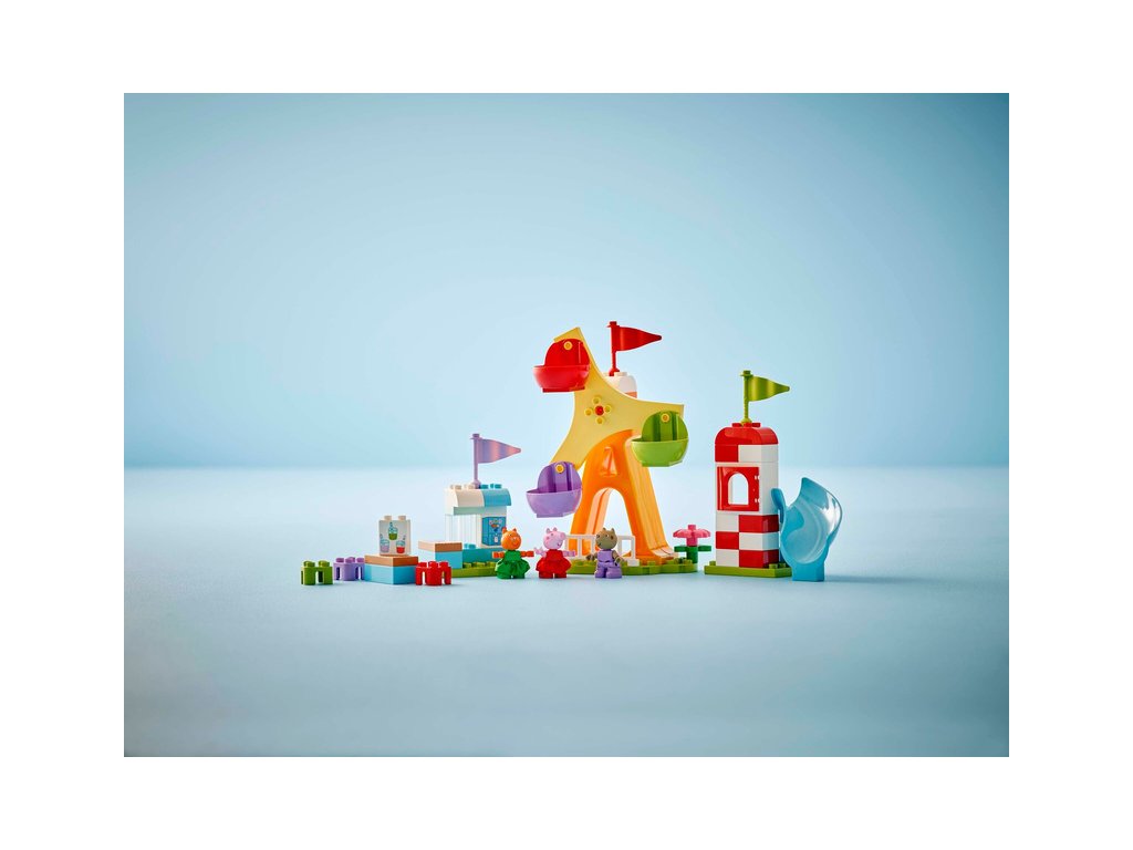 Dopřejte nejmenším dětem akční a dobrodružné hraní se stavebnicí LEGO® DUPLO® Prasátko Peppa Zábavní park. Malé děti od 2 let si můžou každý den hrát v zábavním parku.
