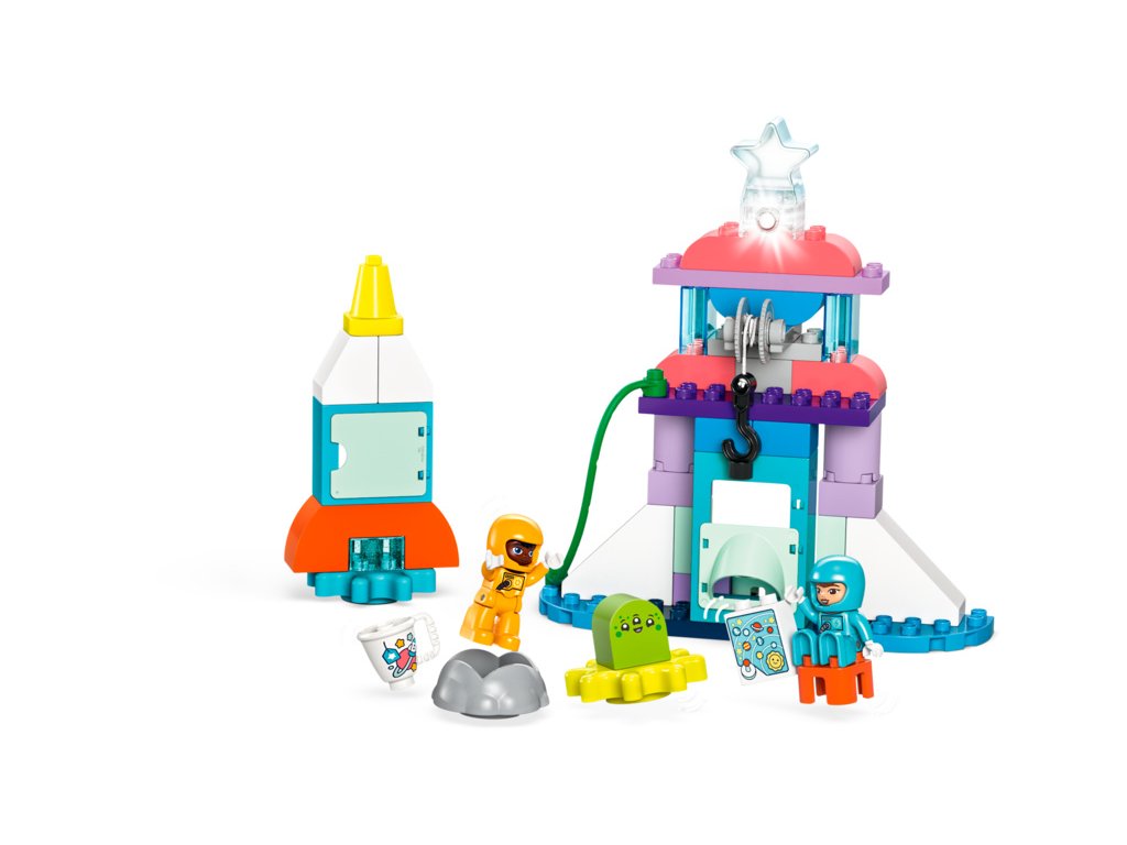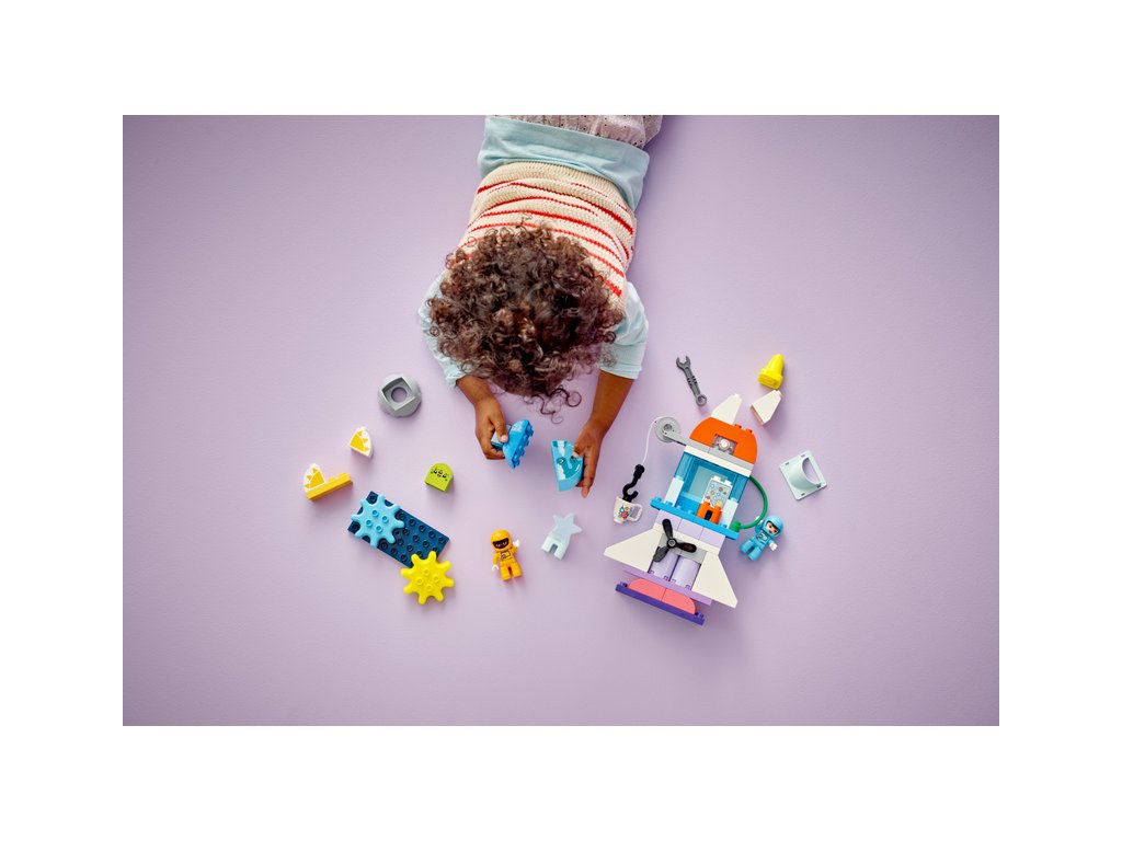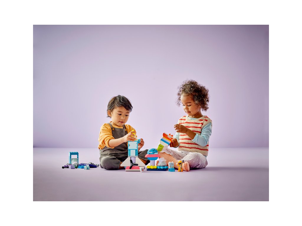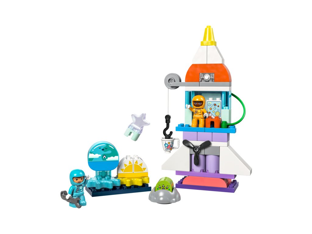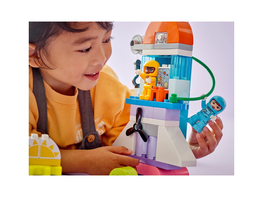 Tato vesmírná hračka je plná zábavných doplňků, které podněcují kreativní hraní. Děti prozkoumají nové obzory a prožijí galaktická dobrodružství se 2 figurkami LEGO® DUPLO® astronautů – spřátelí se s mimozemšťanem nebo se třeba vydají opravit raketoplán pomocí hasáku.