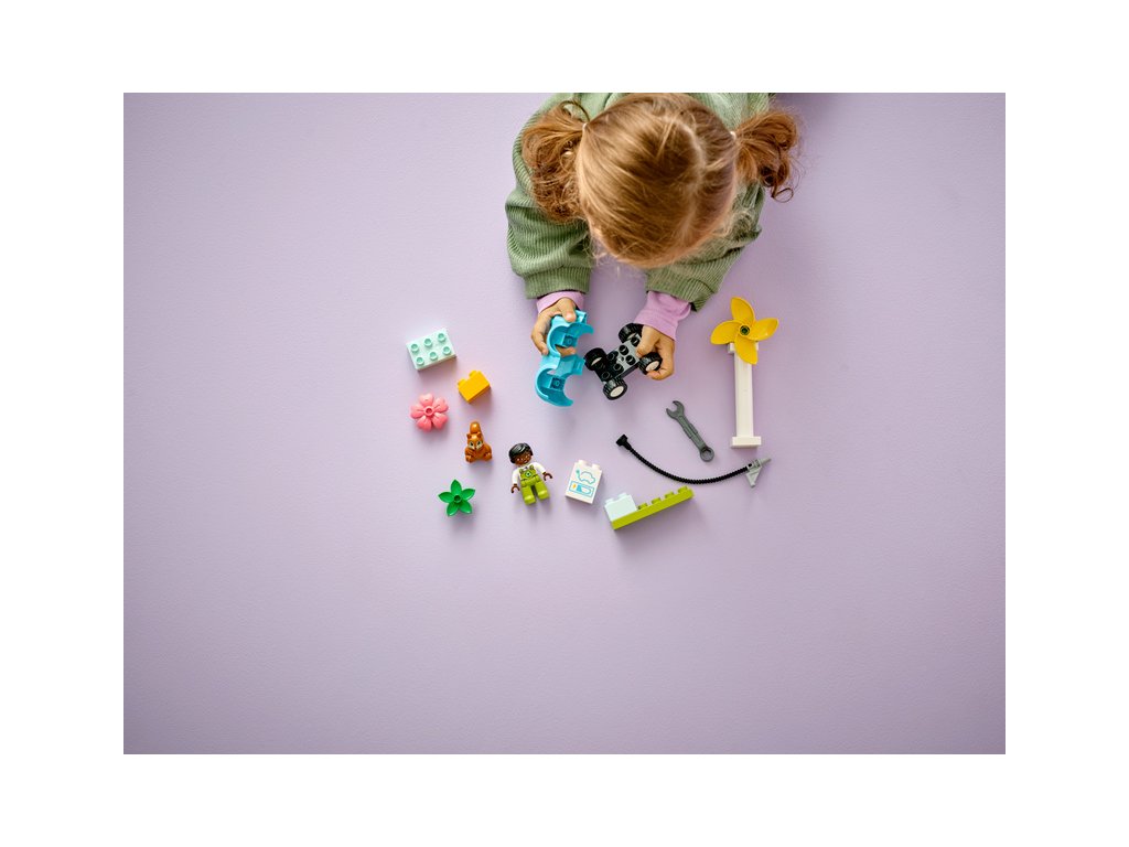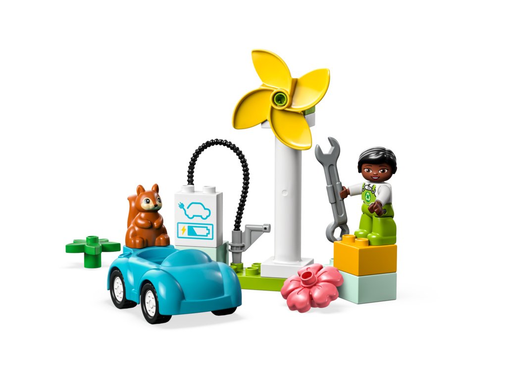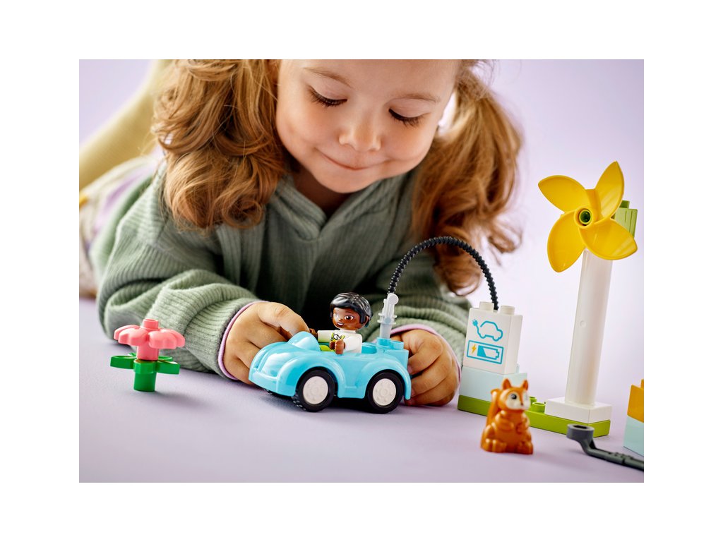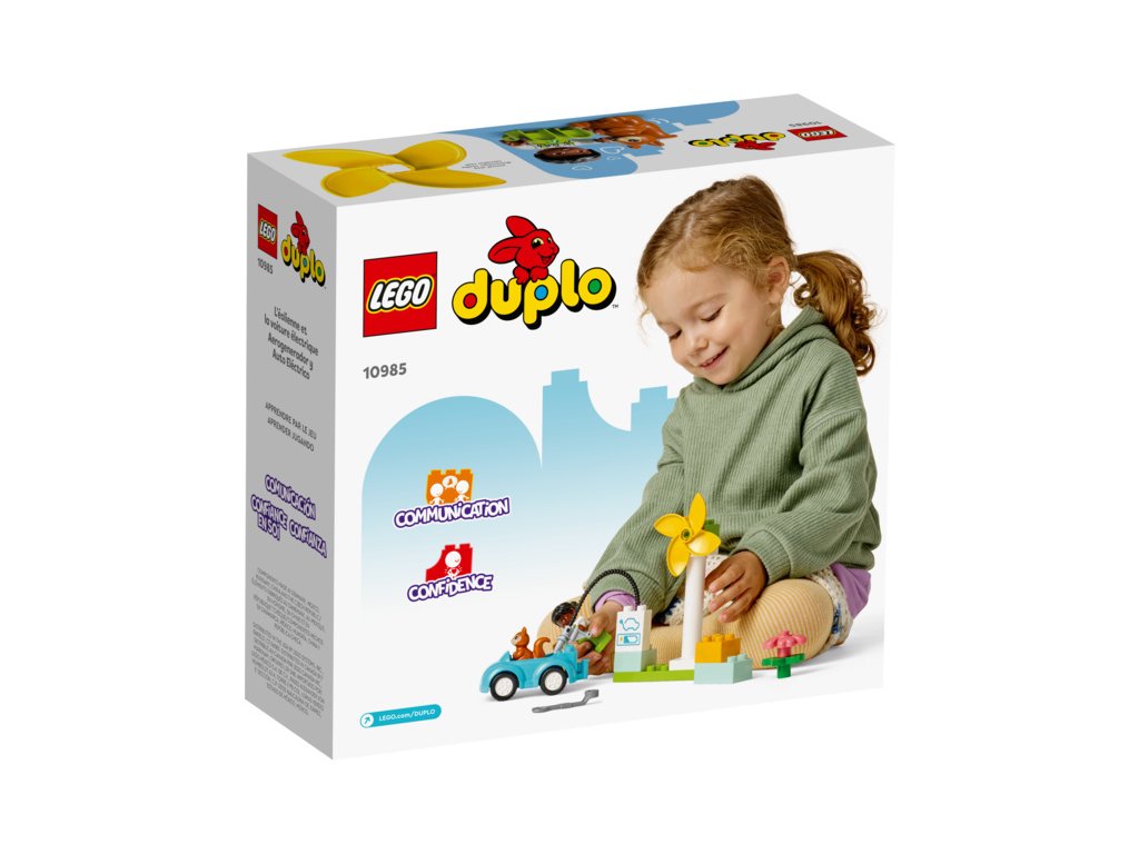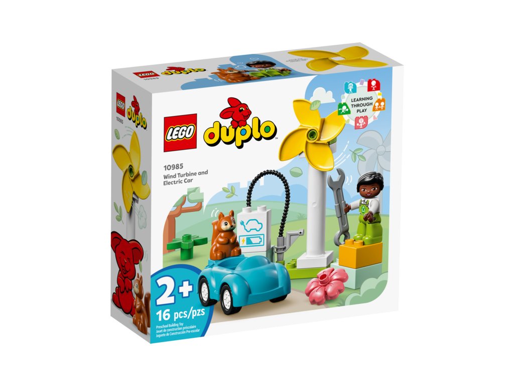 - Zábavná stavebnice pro malé techniky – Pestrobarevný model větrné turbíny a elektromobilu (10985) od LEGO® DUPLO® Town umožní fanouškům aut od 2 let objevovat svět zelené dopravy a trvale udržitelného životního stylu