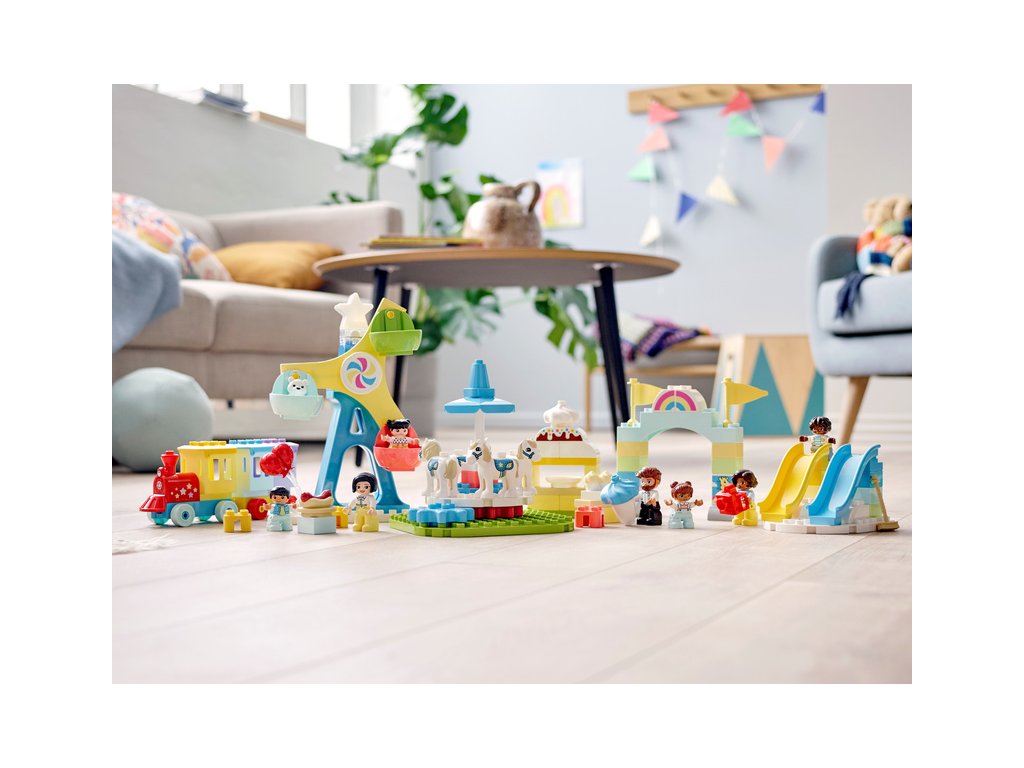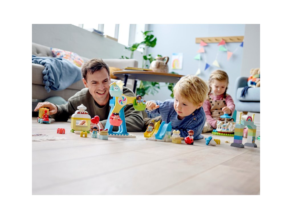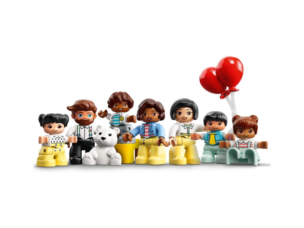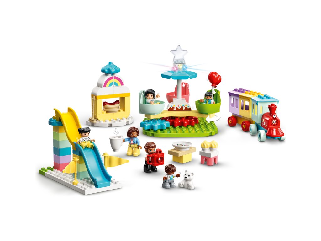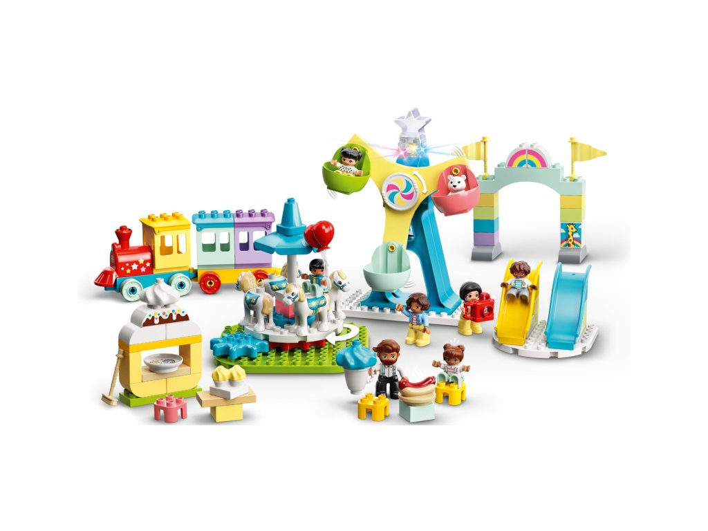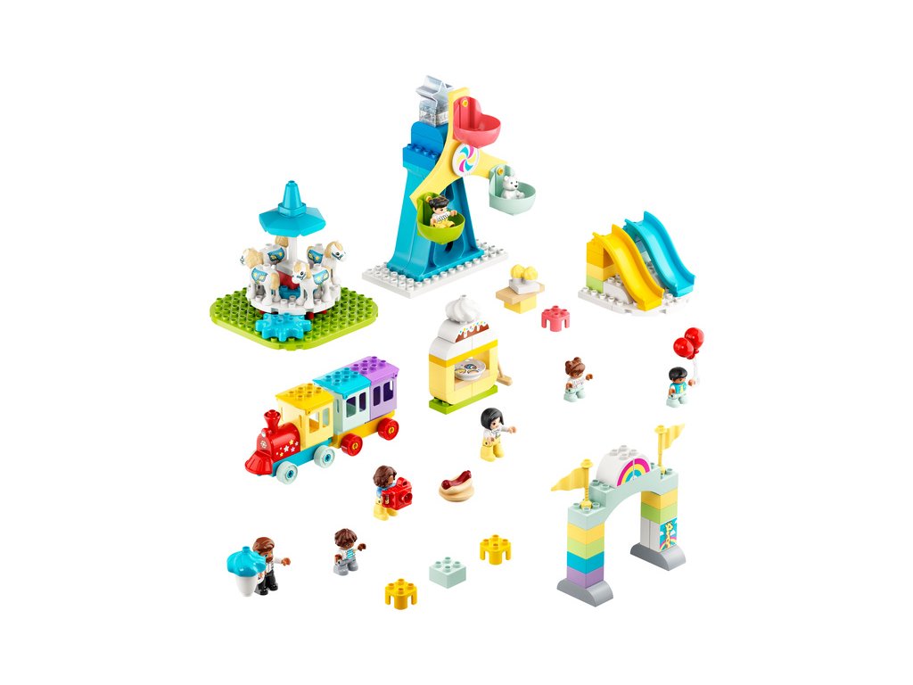 - Sada obsahuje 7 DUPLO postaviček, mezi kterými najdete 2 paní, 1 pána a 4 děti. Dále se můžete těšit na 2 skluzavky, kolotoč s mechanickým pohonem, otočné ruské kolo se 3 barevnými kabinami, vláček a spoustu doplňků.