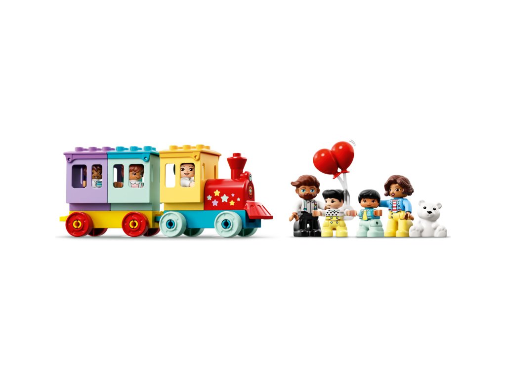 - Model měří přes 28 cm na výšku, 123 cm na šířku a 28 cm do hloubky. Navíc jej můžete neustále přestavovat nebo kombinovat s dalšími sadami a hračkami LEGO® DUPLO®.