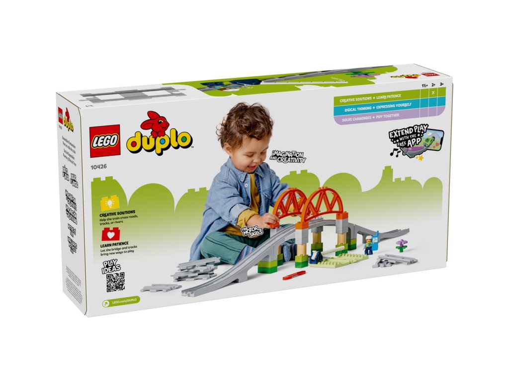 Posuňte hraní vaší ratolesti s vláčky na vyšší úroveň díky rozšiřující sadě Železniční most a koleje (10426). Tato kreativní hračka na stavění a přestavování malým dětem umožňuje ke svým interaktivním stavebnicím LEGO® DUPLO® Město s vláčky (10427 a 10428, prodávají se samostatně) přidat vyvýšený most a prodloužit trasu 8 rovnými dílky kolejí, které jsou kompatibilní se všemi stavebnicemi LEGO DUPLO s vláčky. Součástí je také sestavitelný model mostu a zdvihací závora. Děti od 2 let si užijí spoustu zábavy při hře na inženýra, který pouští vlak, a zároveň procvičí své jemné motorické schopnosti. Díky akční kostce se interaktivní vláčky ze stavebnic 10427 a 10428 zastaví v její blízkosti a při příjezdu k ní vydají zábavné zvuky.