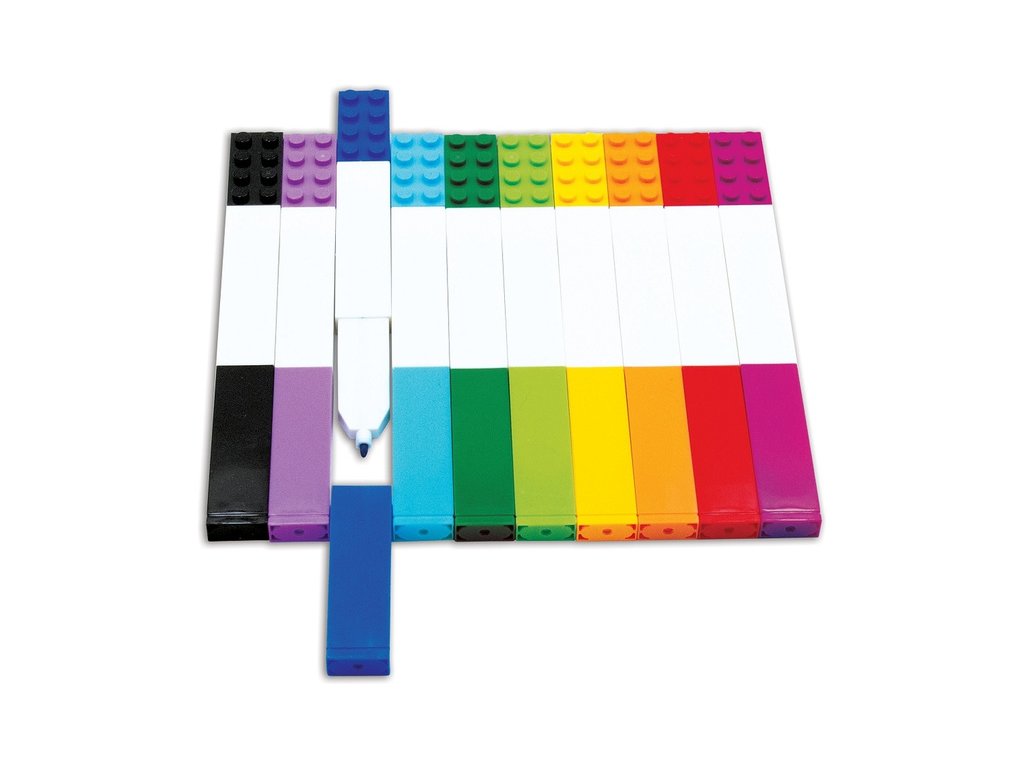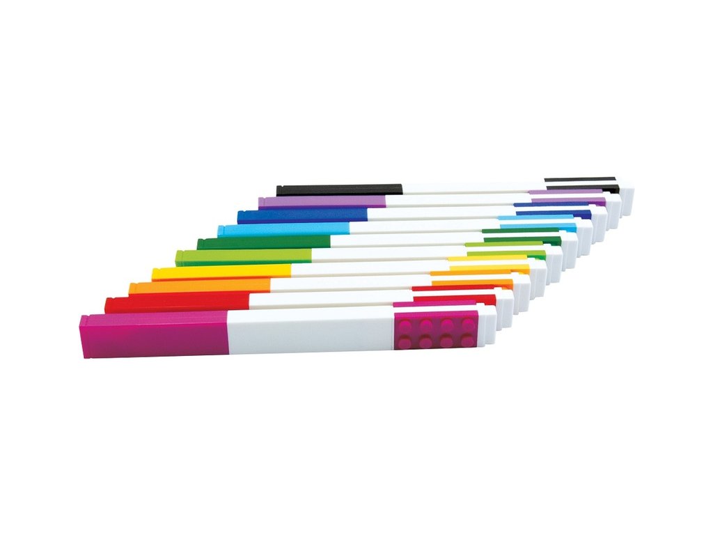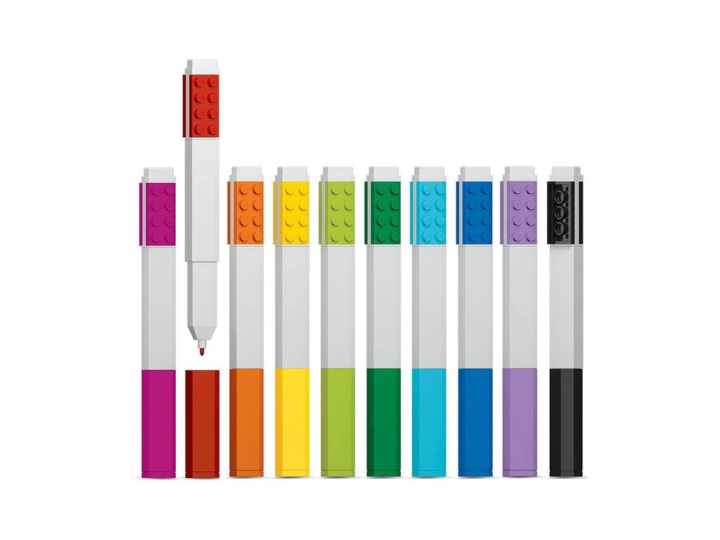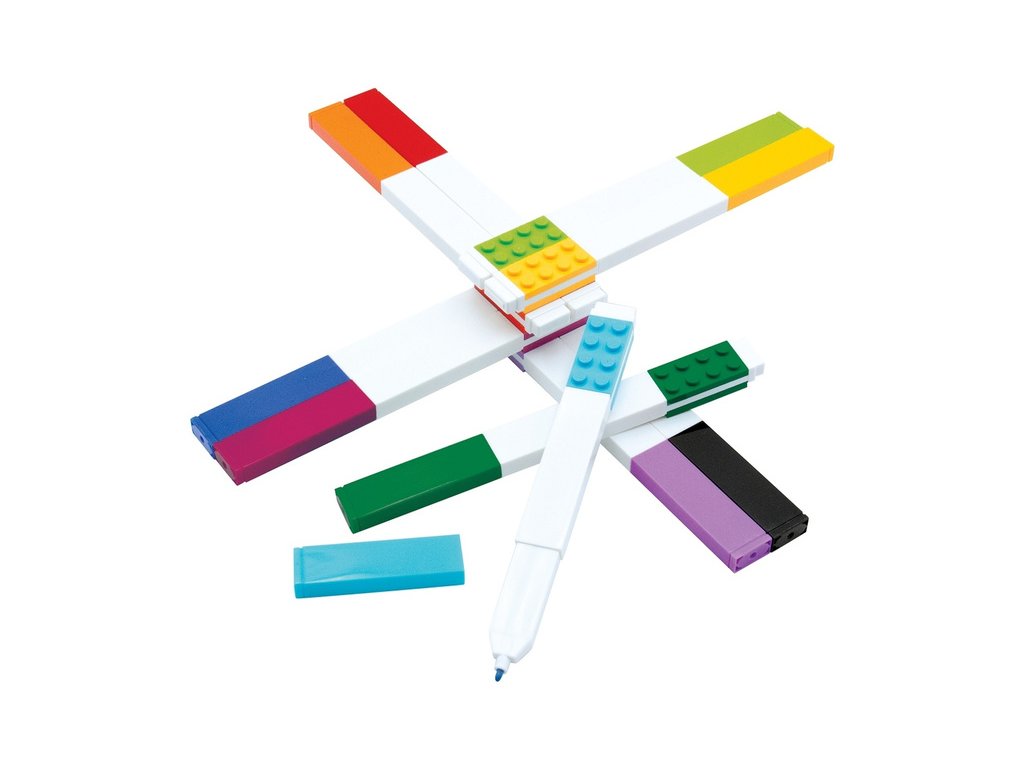 LEGO fixy různých barev (mix 10 barev). Součástí fixů jsou 2 LEGO destičky pro spojení např. s LEGO pouzdrem, minifigurkou, jiným perem nebo k nacvaknutí na LEGO pravítko.
