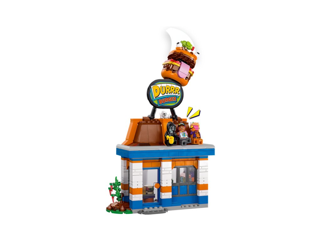 Malí gameři si užijí spoustu zábavy při skládání modulární Restaurace Durrr Burger, kterou si můžou přizpůsobit podle sebe a objevit v ní celou řadu zábavných detailů. Uvnitř budovy děti najdou pult s omáčkami, automat na nápoje a pokladnu. Venku se nachází posezení s šálkem a volským okem. Nechybí také odnímatelné podkroví s figurkou pavouka a dostatkem místa pro další doplňky, včetně lopaty a dynamitu. Minifigurky Beach Bombera, Beef Bosse, Grimeyho a kostlivce vdechnou stavebnici život a inspirují děti k nápaditému hraní.