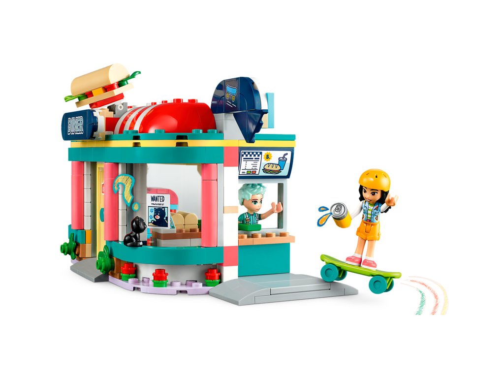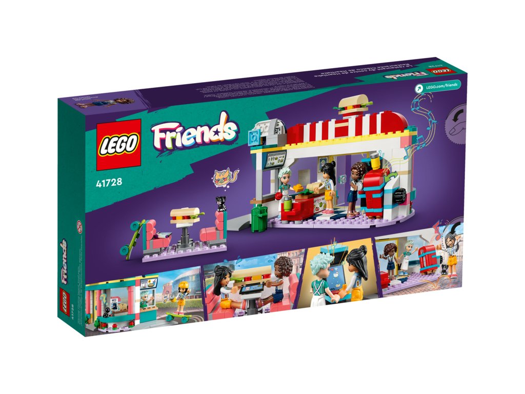 Se stavebnicí Bistro v centru městečka Heartlake od LEGO® Friends (41728) si děti od 6 let vyzkouší spoustu rolí, s nimiž se mohou setkat v restauraci. K dispozici budou mít pestrou škálu doplňků, které inspirují ke kreativnímu hraní, takže si mohou hrát na to, že chystají sendviče nebo že jsou zákazníky, kteří se přišli najíst. Model se pyšní výdejním okénkem, venkovním posezením, videoherním automatem a pohyblivým jukeboxem. Děti také mohou použít ingredience na salát z lednice, aby si sendvič upravili dle vlastní chuti. Nechybí ani 2 nápoje, peníze, 3 krajíce chleba na sendviče, držák na ubrousky, koš na odpadky a skateboard. Někdy bistro navštíví i loupeživá kočička!