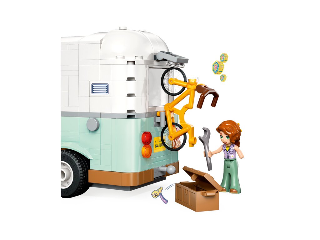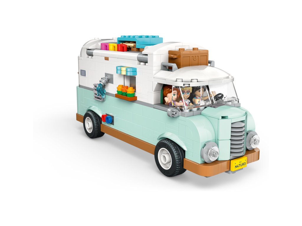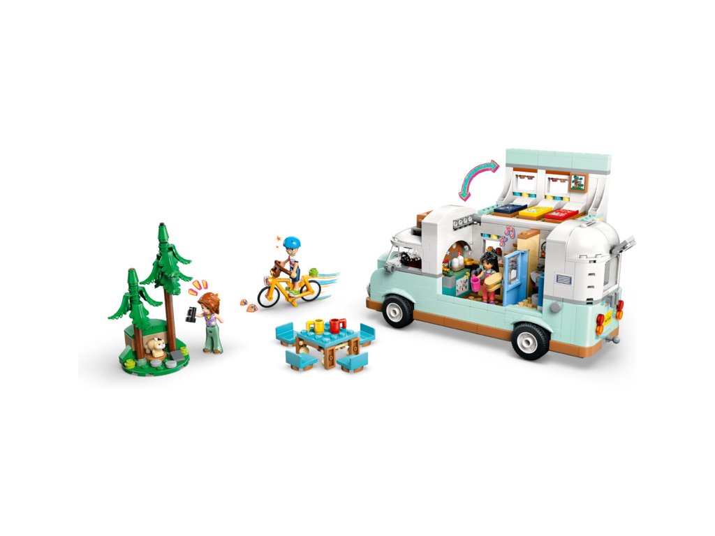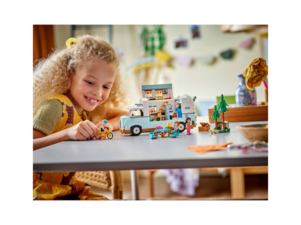 V této stavebnici karavanu pro děti najdete vše, co malí průzkumníci potřebují k vyprávění vlastních příběhů o kempování. Kamarádi sedí v kabině řidiče a hledají dokonalé místo na zaparkování v lese. Otevřete karavan a odhalte vybavenou kuchyň a toaletu. Zaručeně uslyšíte chichot, když děti uvidí, jak po „spláchnutí“ záchodu mizí odpad! Schody vedou do prostoru na spaní, kde je postel pro každou ze 3 minipanenek. Mezi další detaily patří kolo, na kterém mohou postavičky jezdit, piknikový stůl s židlemi, venkovní sprcha a kempingové doplňky včetně kompasu, klíče a dalekohledu.