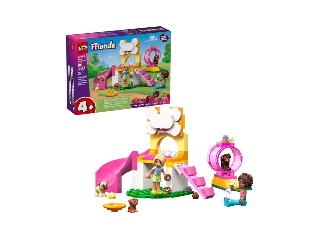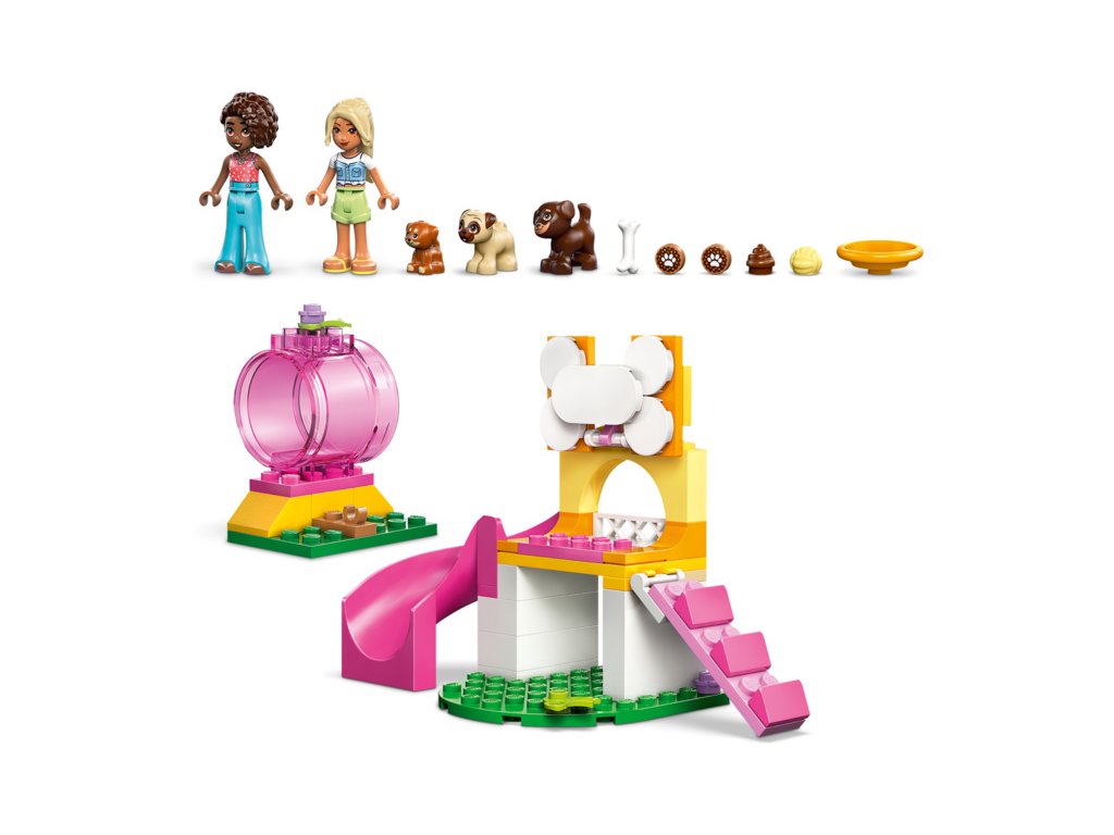 - Stavebnice nabitá štěněcí roztomilostí – Stavebnice LEGO® Friends Hřiště pro štěňátka pro holky a kluky od 4 let obsahuje sestavitelné hřiště, 2 minipanenky, 3 figurky psů a doplňky