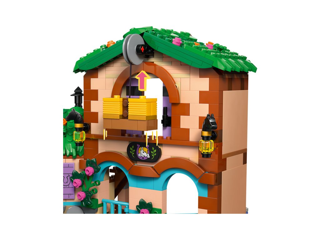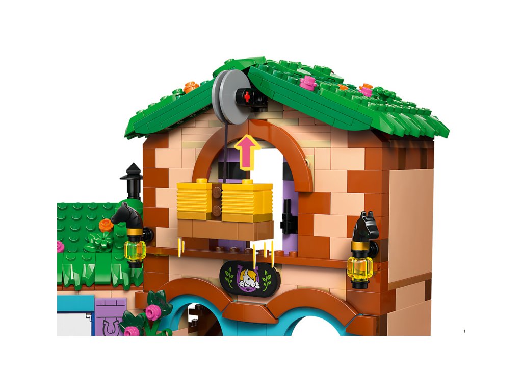 - Funkční výtah na seno – Součástí stavebnice je výtah na seno, který zvedá a spouští balíky sena, aby je děti mohly snadno přepravovat k poníkům nebo do seníku a aby si mohly vymýšlet vlastní příběhy ze stáje