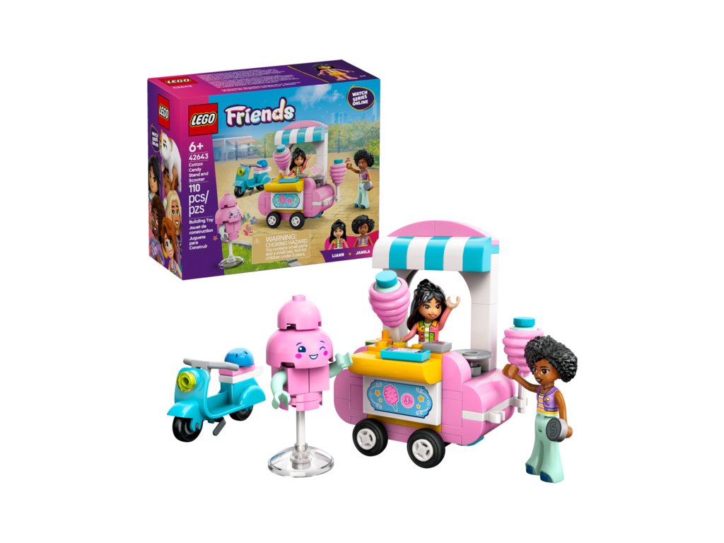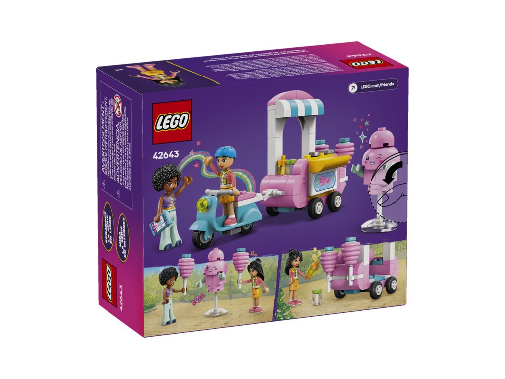 Inspirujte děti od 6 let k sladké hře na postavy LEGO® Friends (42643) Stánek s cukrovou vatou a skútr. Součástí stavebnice jsou 2 minipanenky LEGO Friends a sestavitelný pojízdný vozík s občerstvením, skútr, maskot a doplňky.
