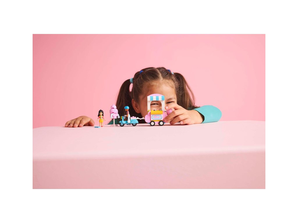 Inspirujte děti od 6 let k sladké hře na postavy LEGO® Friends Stánek s cukrovou vatou a skútr. Součástí stavebnice jsou 2 minipanenky a sestavitelný pojízdný vozík s občerstvením.