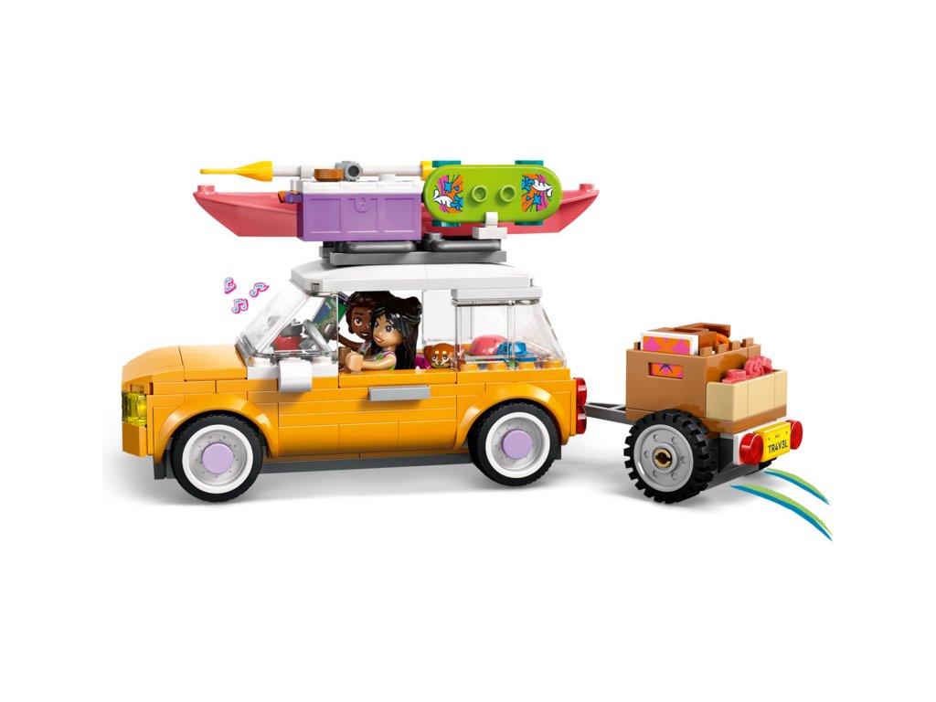Vydejte se s dětmi na kreativní cestu a pomozte Liann a Aliye naložit do auta a odnímatelného přívěsu vše, co potřebují na cestu. Kamarádky sedí vepředu – vzadu v autě je sedadlo pro pejska Airu. Mezi doplňky najdete kajak, 2 helmy, skateboard, kolečkové brusle, 2 židle a chladicí box se sendvičem, donutem, sušenkou, třešněmi a pamlsky pro psa. Až přijde čas na svačinu, chladicí box poslouží i jako piknikový stůl.