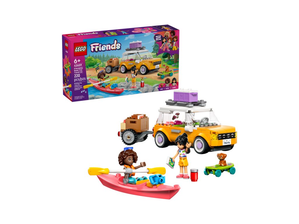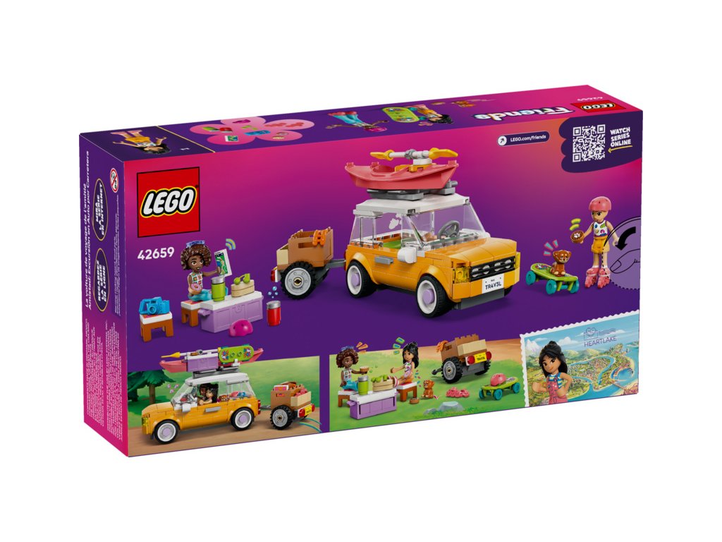 Vstupte do světa dobrodružství se stavebnicí LEGO® Friends (42659) Výlet v autě s přáteli pro holky a kluky od 6 let. Tato akcí nabitá stavebnice obsahuje model auta s přívěsem, 2 minipanenky LEGO Friends, roztomilou figurku štěňátka a spoustu doplňků, které inspirují k zábavnému hraní.